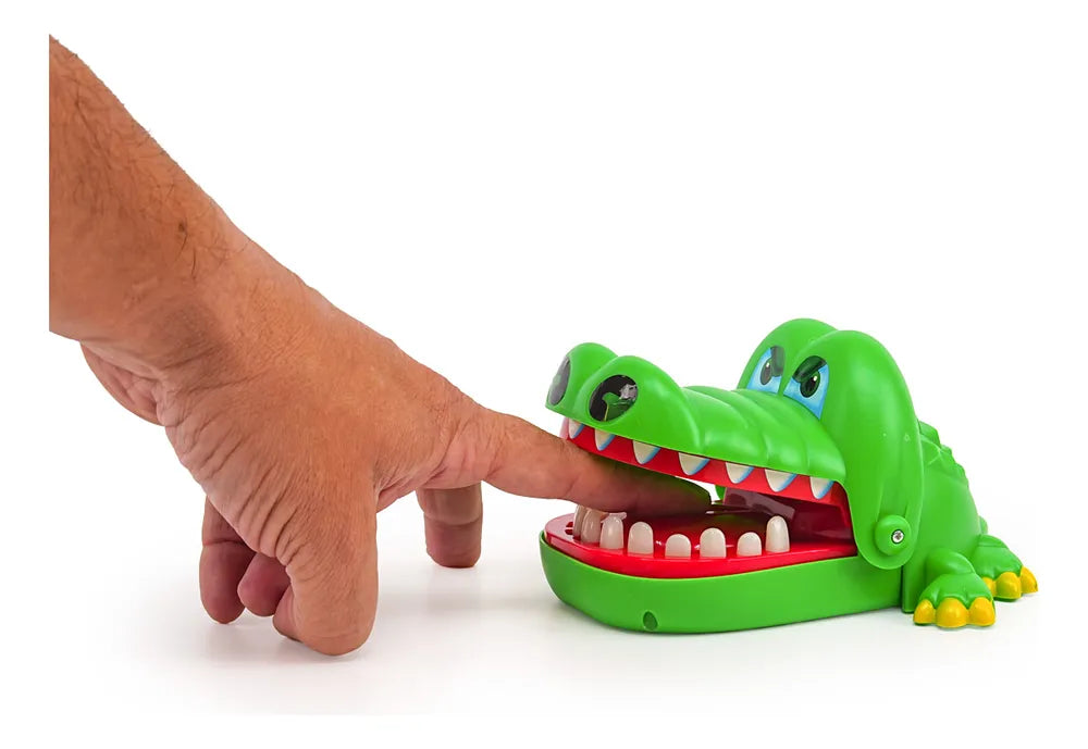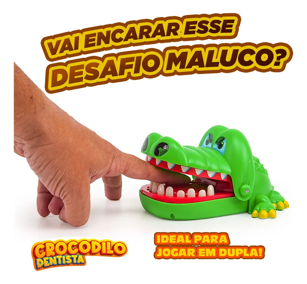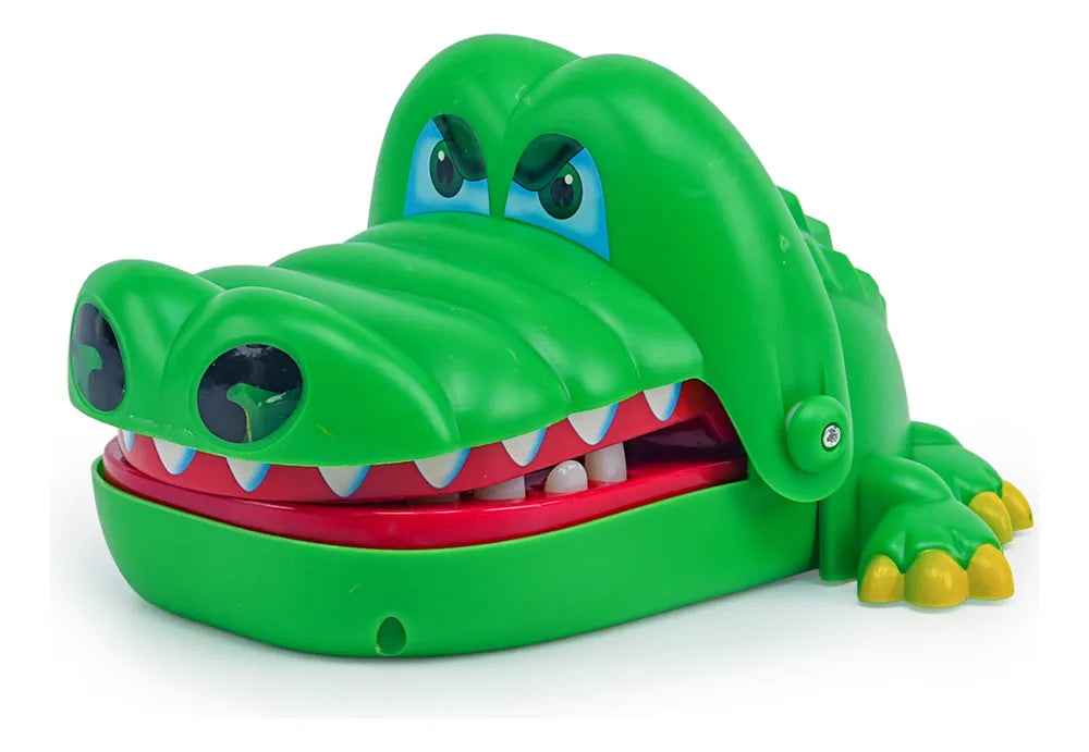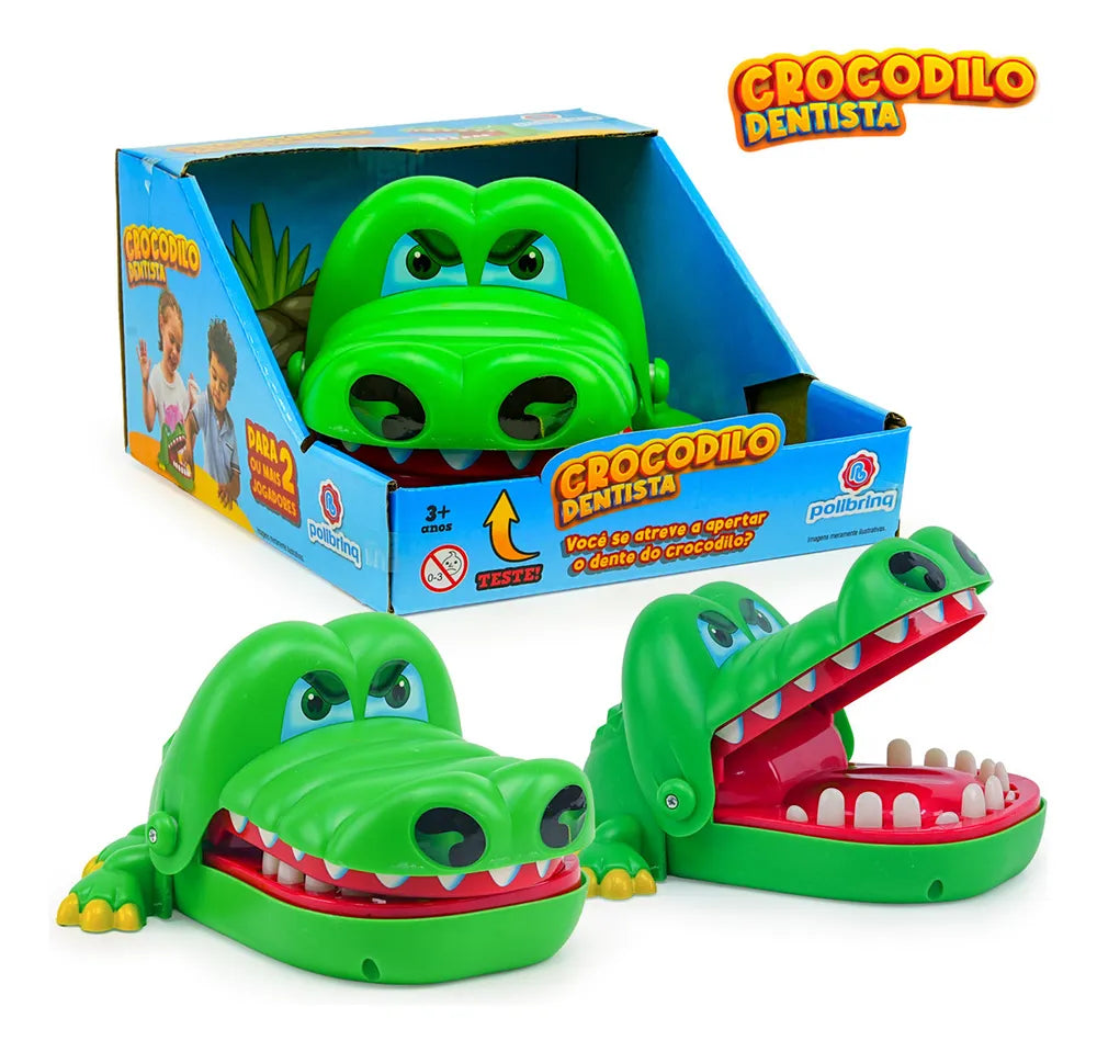 O Jogo Crocodilo Dentista é um clássico de suspense e diversão que une gerações através de momentos emocionantes compartilhados. A mecânica é simples mas envolvente: os jogadores alternam turnos pressionando os dentes do crocodilo um por vez, mas apenas um dente específico (que muda aleatoriamente a cada rodada) ativará a mola que faz a boca do crocodilo fechar repentinamente.