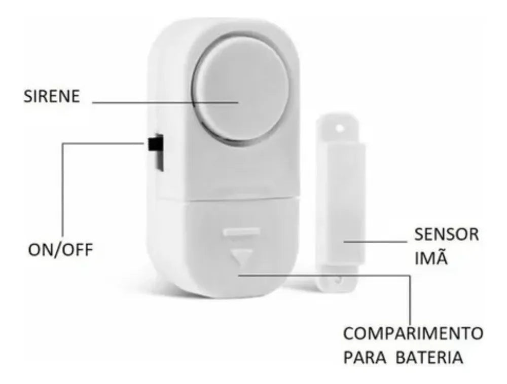 O alarme contém fita dupla face resistente para fixa-lo no lugar desejado, além de obter botão liga/desliga para aciona-lo no momento que desejar para evitar incômodos.
