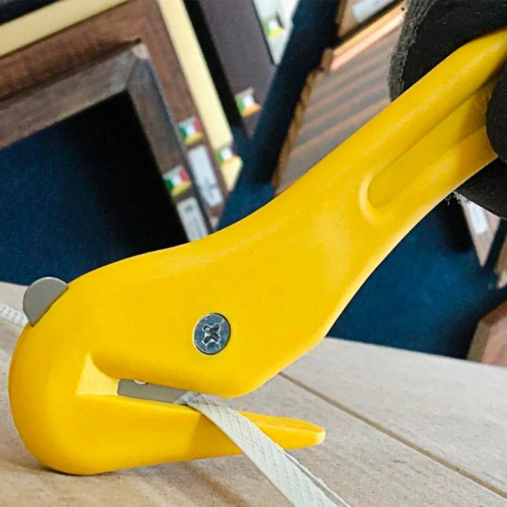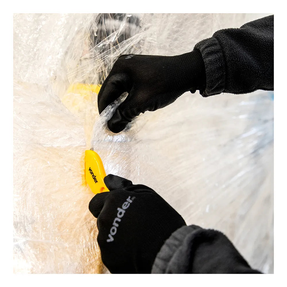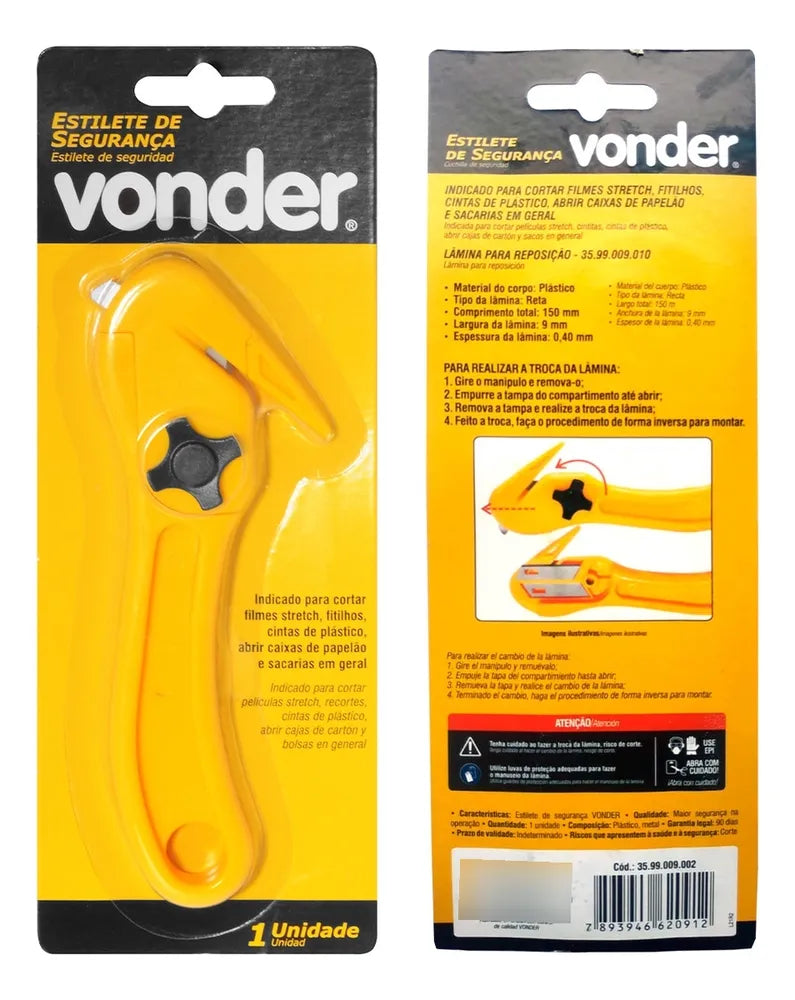 O Estilete de Segurança Pelicano Bico De Pato Vonder é um produto de alta qualidade e eficiência, com lâmina reta de 9mm e corpo em plástico. Ele é ideal para cortar filmes stretch, fitilhos, cintas de plástico, abrir caixas de papelão e sacarias em geral. O estilete acompanha 2 lâminas cortantes, sendo uma pronta para uso e outra sobressalente armazenada internamente, além de uma lâmina curta não cortante. A lâmina cortante é coberta com um bico guia que evita cortes indesejados ou acidentes, enquanto a lâmina curta não cortante facilita a abertura de caixas de papelão.