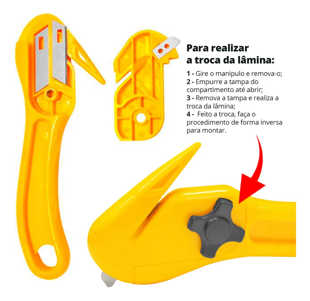 - 2 lâminas cortantes, (1 pronta para uso e 1 sobressalente armazenada internamente) e 1 lâmina curta não cortante.