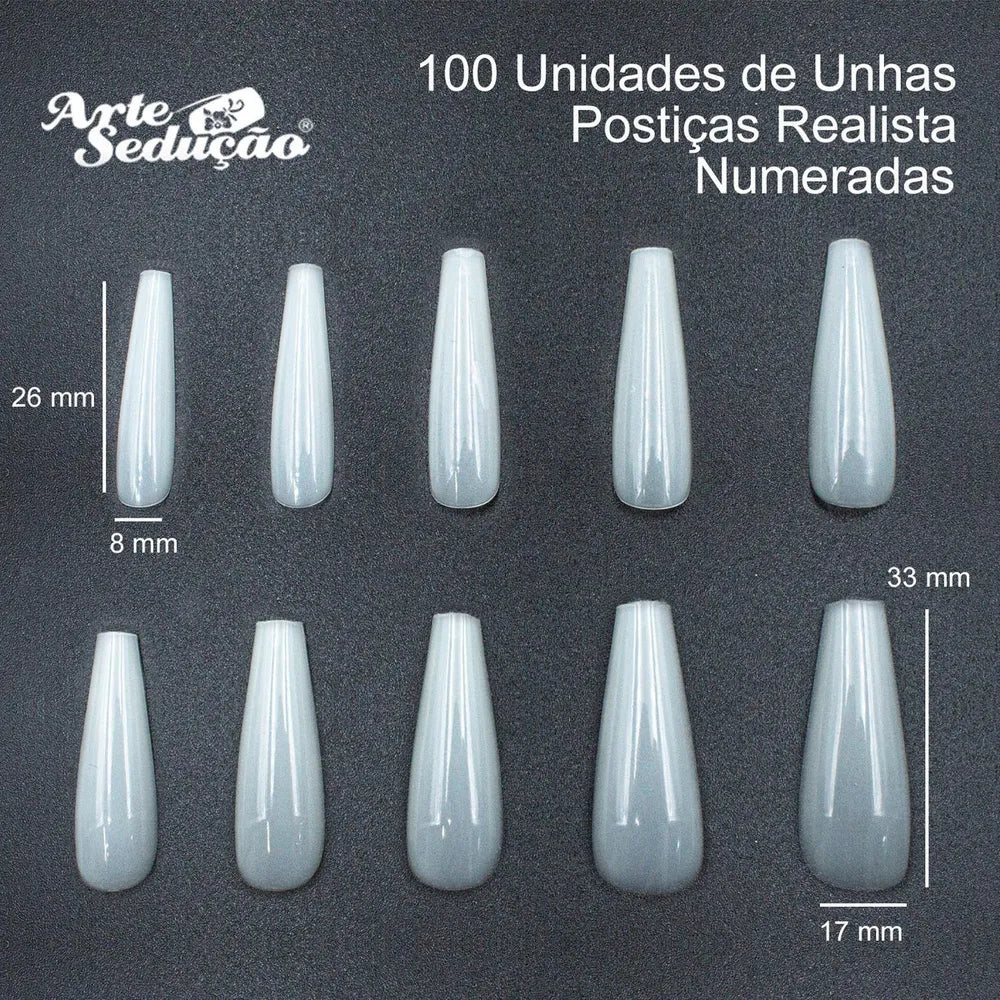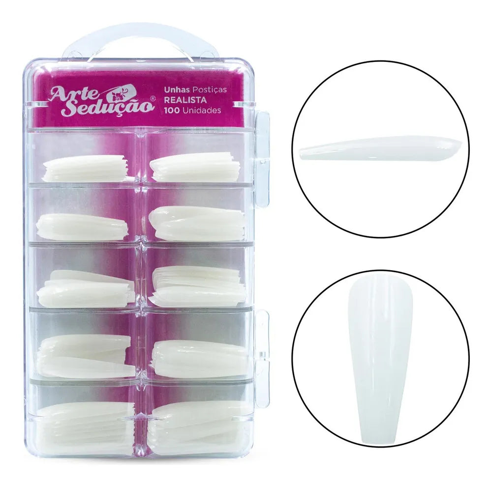 01 - Caixa Acrílica com 100 Unidades de Unhas Postiças Formato Realista Leitosa, Arte Sedução