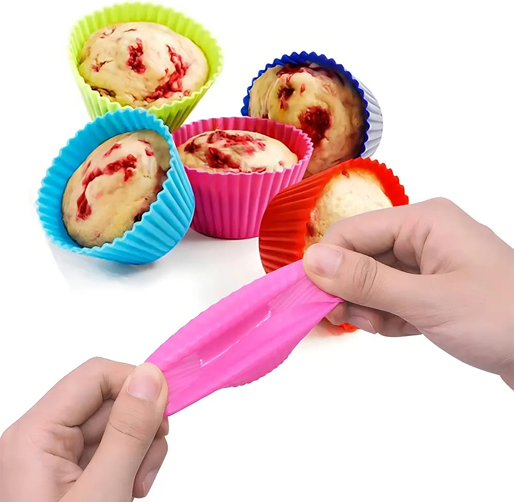 O kit contém 12 forminhas redondas de silicone, com 8 cores diferentes. O material é altamente durável, flexível e fácil de usar. As forminhas podem ser levadas ao freezer, forno convencional, micro-ondas e até mesmo à máquina de lavar louças, tornando-as práticas e eficientes para qualquer receita.