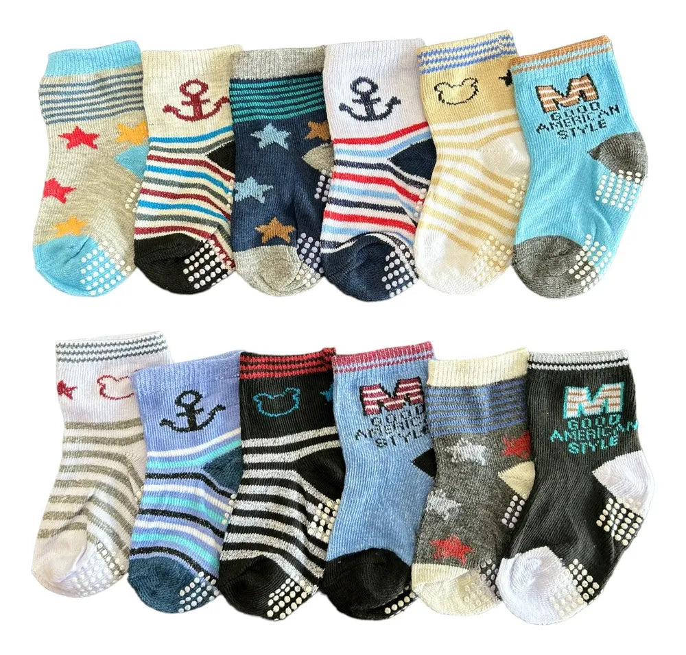 Coloridas 6 a 12 Meses Com Antiderrapante - Kit com 12 Pares de Meias Masculino Infantil