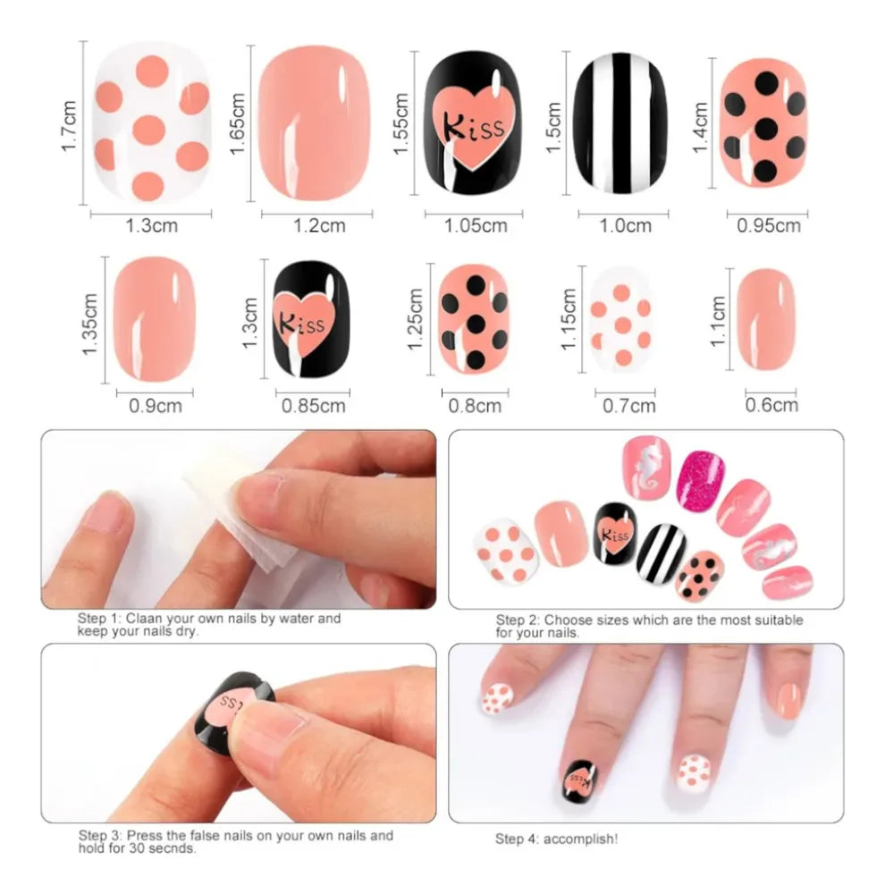 Modo de Uso: Selecione o tamanho correto para cada unha. Para um melhor resultado, use um tamanho menor. Limpe as unhas, alinhe a unha postiça com a cutícula e pressione com firmeza, do centro para os lados.