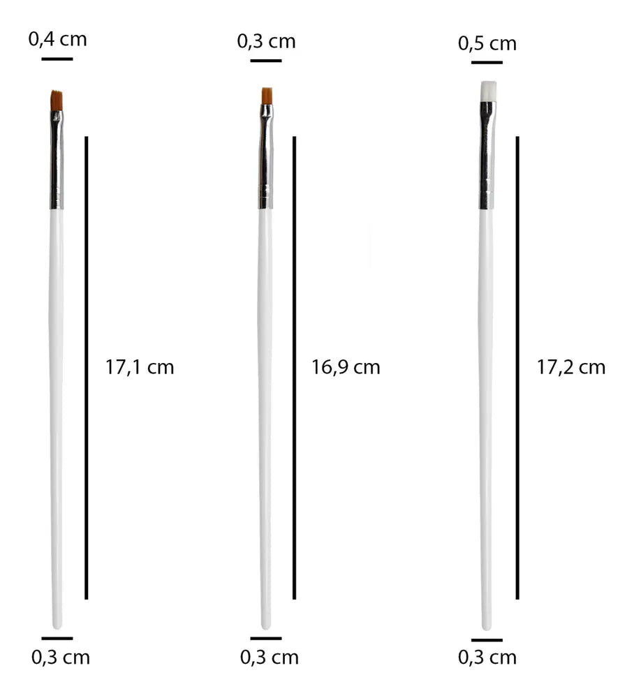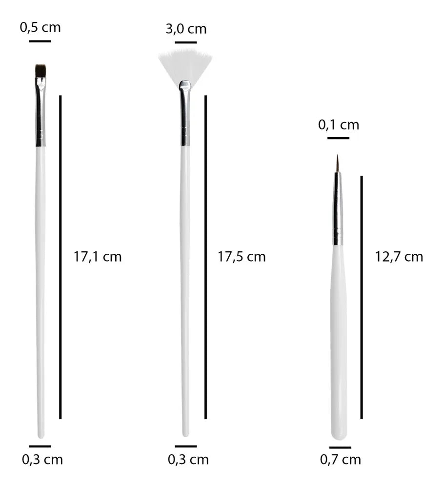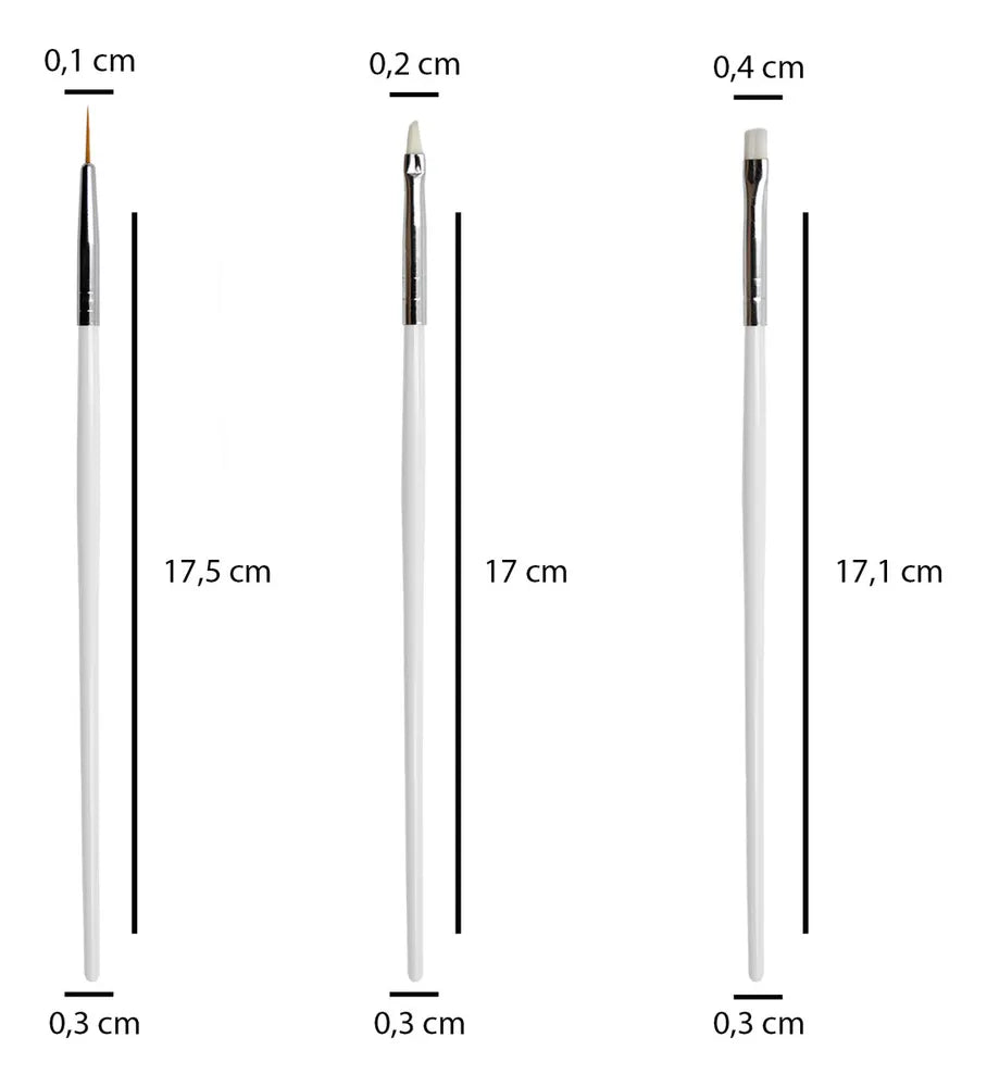 Pincéis de alta qualidade e ótimo custo-benefício. Desenvolvidos para decoração de unhas e alongamentos como de gel, acrílico e porcelana. Permitem a criação de lindos desenhos, modelos, formas e pinturas artísticas, em unhas naturais ou artificiais.