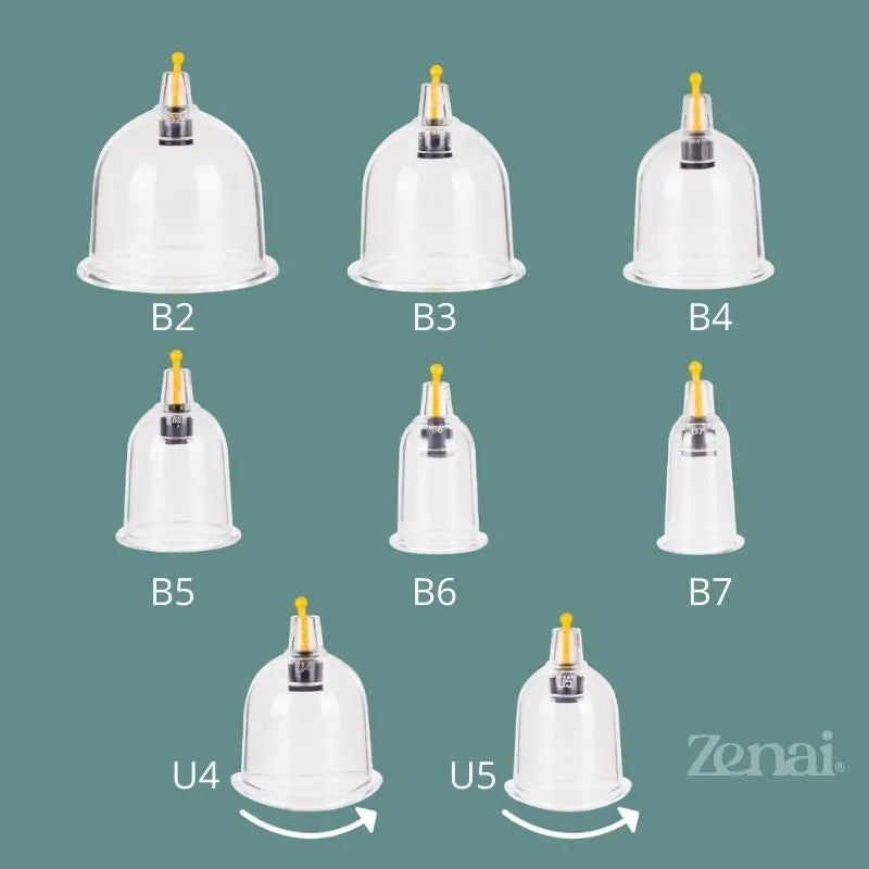 O Kit da Zenai é para todos os que trabalham com essa terapia e traz 18 ventosas com formatos variados, desde as menores, para tratar pequenas áreas, até as de maior formato, com destaque para as ventosas especialmente desenhadas com a boca curva — em U — para tratar as áreas curvas do corpo. Os copos são de material resistente e de fácil higienização.
