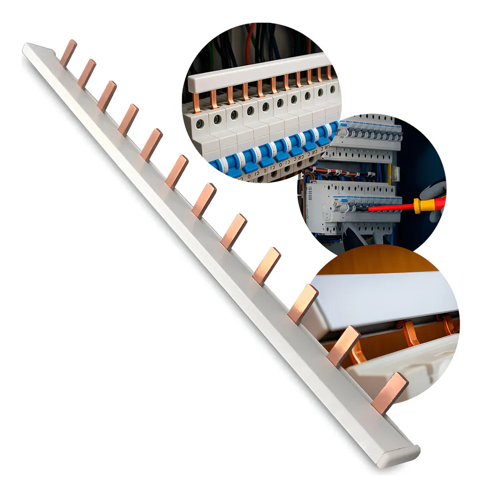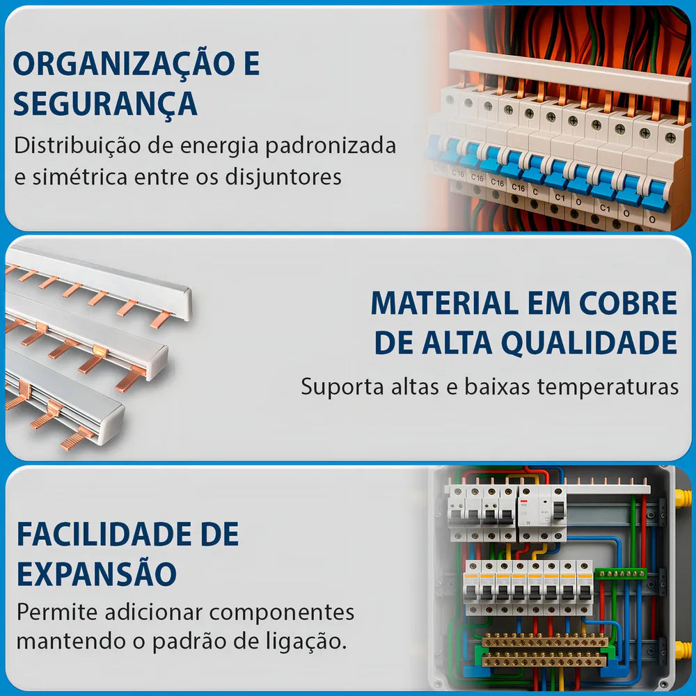 • Ideal para conexão elétrica de disjuntores, DRs e DPSs (padrão DIN), o barramento tipo pente facilita a distribuição de energia no quadro elétrico, conectando os dispositivos de forma prática e segura através da fase.