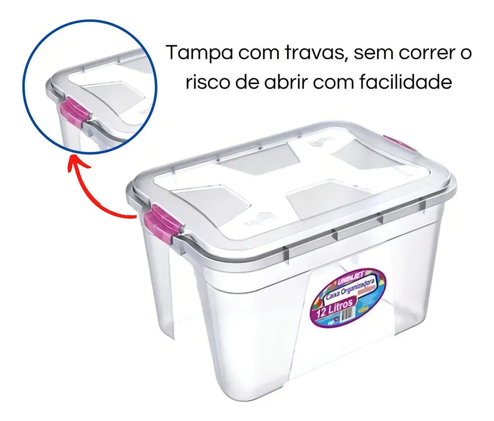 Esta caixa organizadora é prática e versátil para as mais diversas finalidades, como alimentos, documentos, brinquedos. Possui trava de fechamento que prende a tampa à caixa plástica e garante segurança aos itens armazenados. Sua transparência permite a visualização do conteúdo, dispensando a etiquetagem externa.