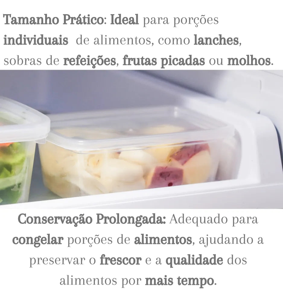 Produzido em plástico livre de BPA, o conjunto garante a conservação dos alimentos sem alterar sabor ou aroma, oferecendo total segurança alimentar.