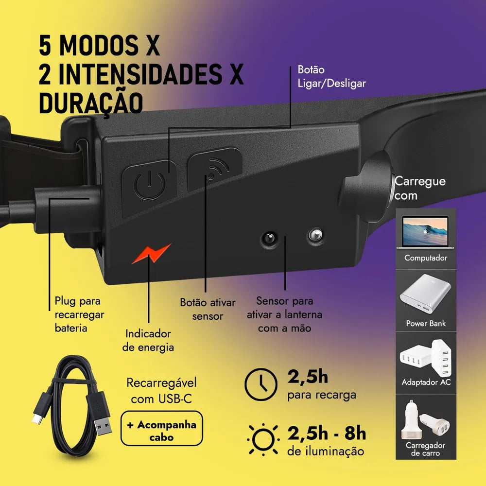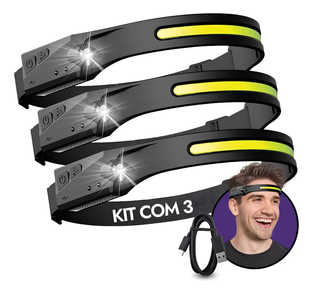 Kit 3 Lanternas de Cabeça Testa Fita Ajustável Super Led Recarregável USB Potente Pesca Bike À Prova D'Água Com Sensor Movimento.