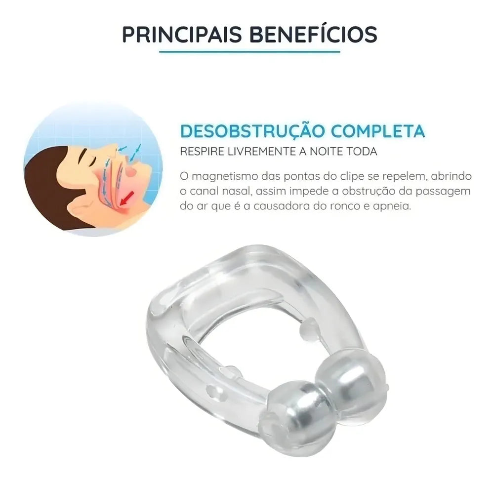 O clipe contém ímãs embutidos que ajudam a manter o canal nasal aberto durante o sono. Seu design anatômico se adapta ao nariz de forma confortável, promovendo uma respiração mais eficiente e silenciosa.