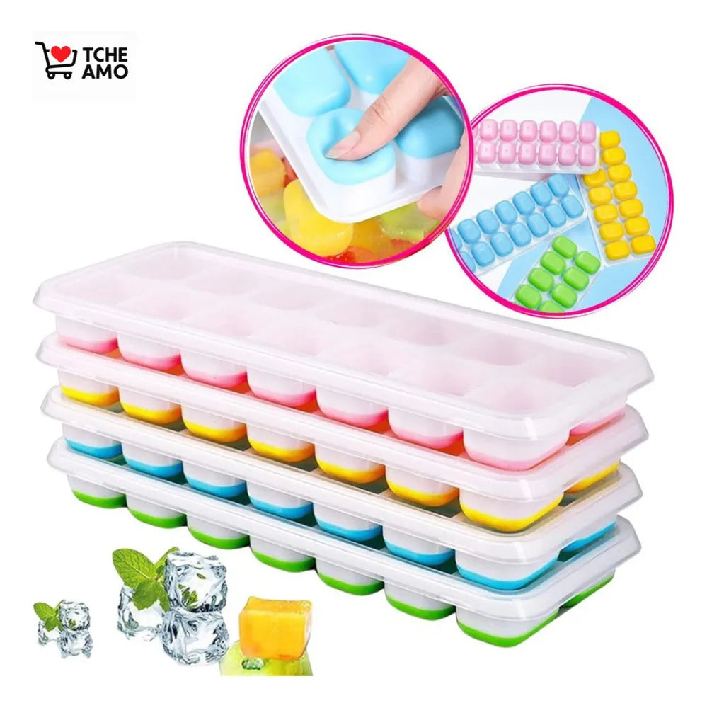 Kit Tche Amo com 4 Formas de Gelo Cubo com Tampa Rígida Flexível Fundo Silicone.