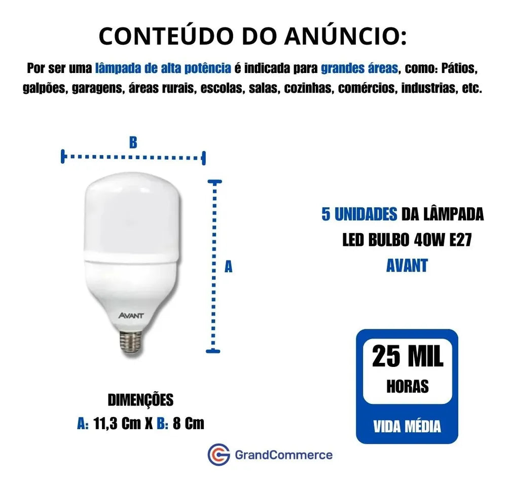 A Lâmpada LED Bulbo HP Avant de 40W oferece iluminação potente e eficiente para grandes espaços, ideal para ambientes industriais e comerciais que necessitam de alta visibilidade. Sua luz branca fria (6500K) garante um ambiente claro e vibrante, perfeito para tarefas que exigem precisão e atenção.