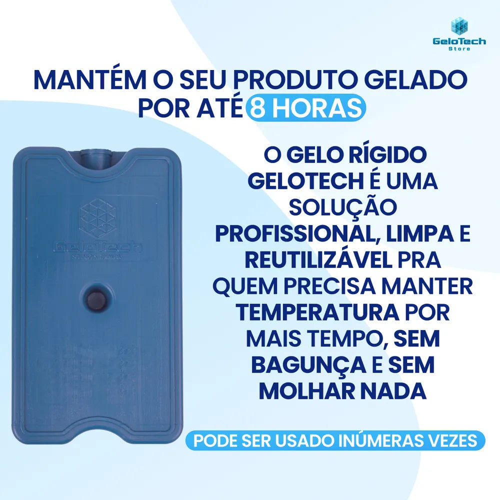 O gelo rígido Gelotech é a alternativa inteligente e eficiente ao gelo tradicional, oferecendo mais tempo de resfriamento, sem molhar e sem desperdício. Produzido com um gel térmico atóxico de alto desempenho, ele mantém a temperatura ideal por muito mais tempo e pode ser reutilizado inúmeras vezes.