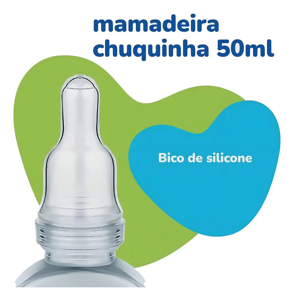 A Chuquinha de 50ml com bico tamanho 0 (recém nascidos até os 3 meses) possui material macio, maleável e com furo pequeno para que o fluxo dos líquidos seja lento.