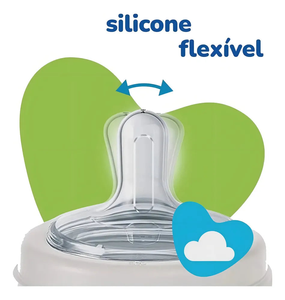 - Mamadeira 150ml (De 0 à 6 meses): possui bico em silicone de fácil higienização.