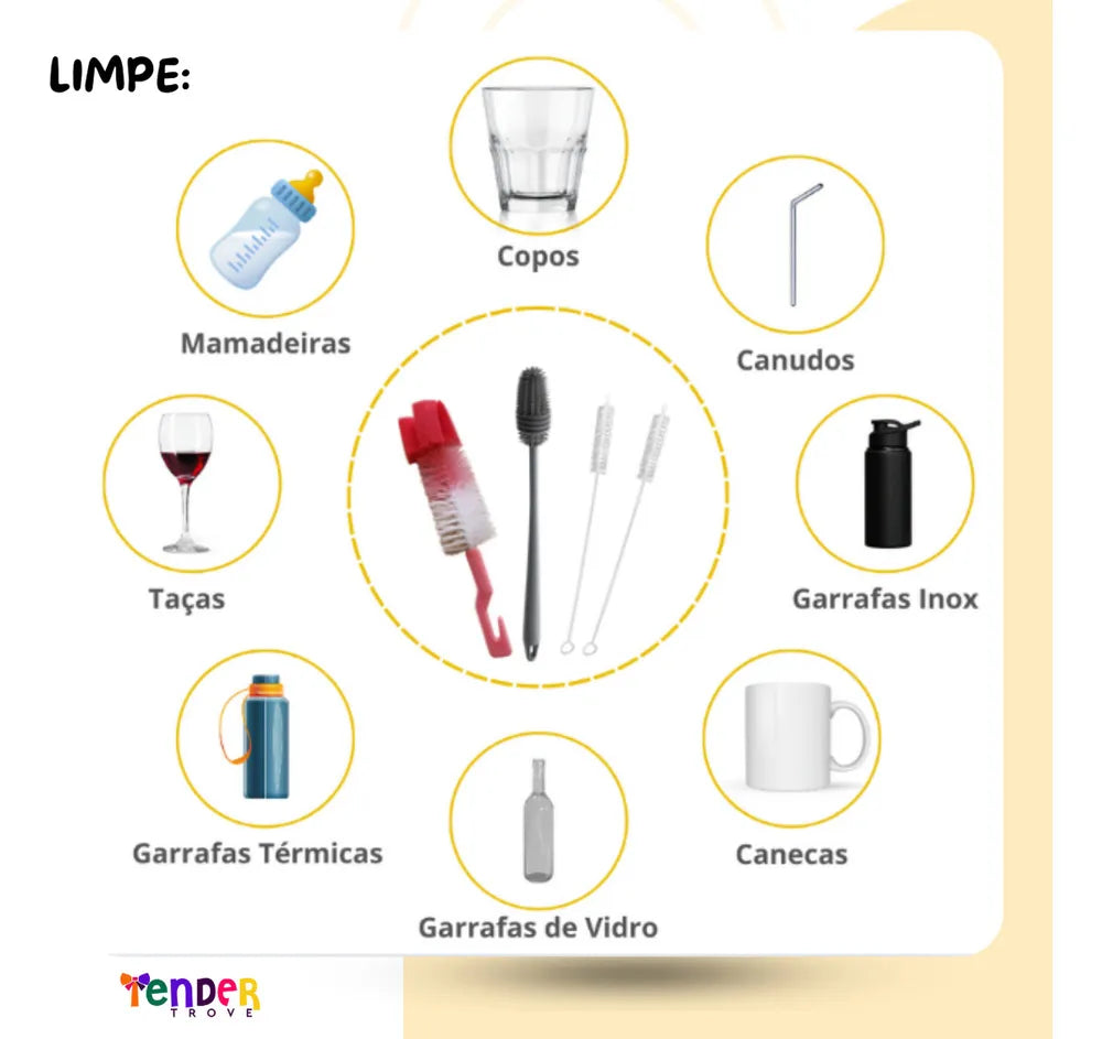 Se você busca um kit completo, versátil e durável para a limpeza diária de utensílios variados — desde mamadeiras até garrafas térmicas —, esta é a solução ideal. O Kit de Escovas Multiuso 4 em 1 da Tender Trove combina materiais de alta performance com design funcional, garantindo limpeza profunda mesmo nos locais mais difíceis de alcançar.