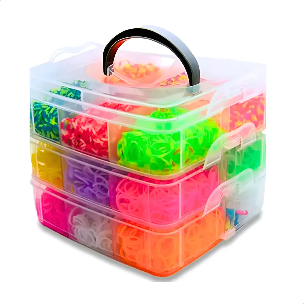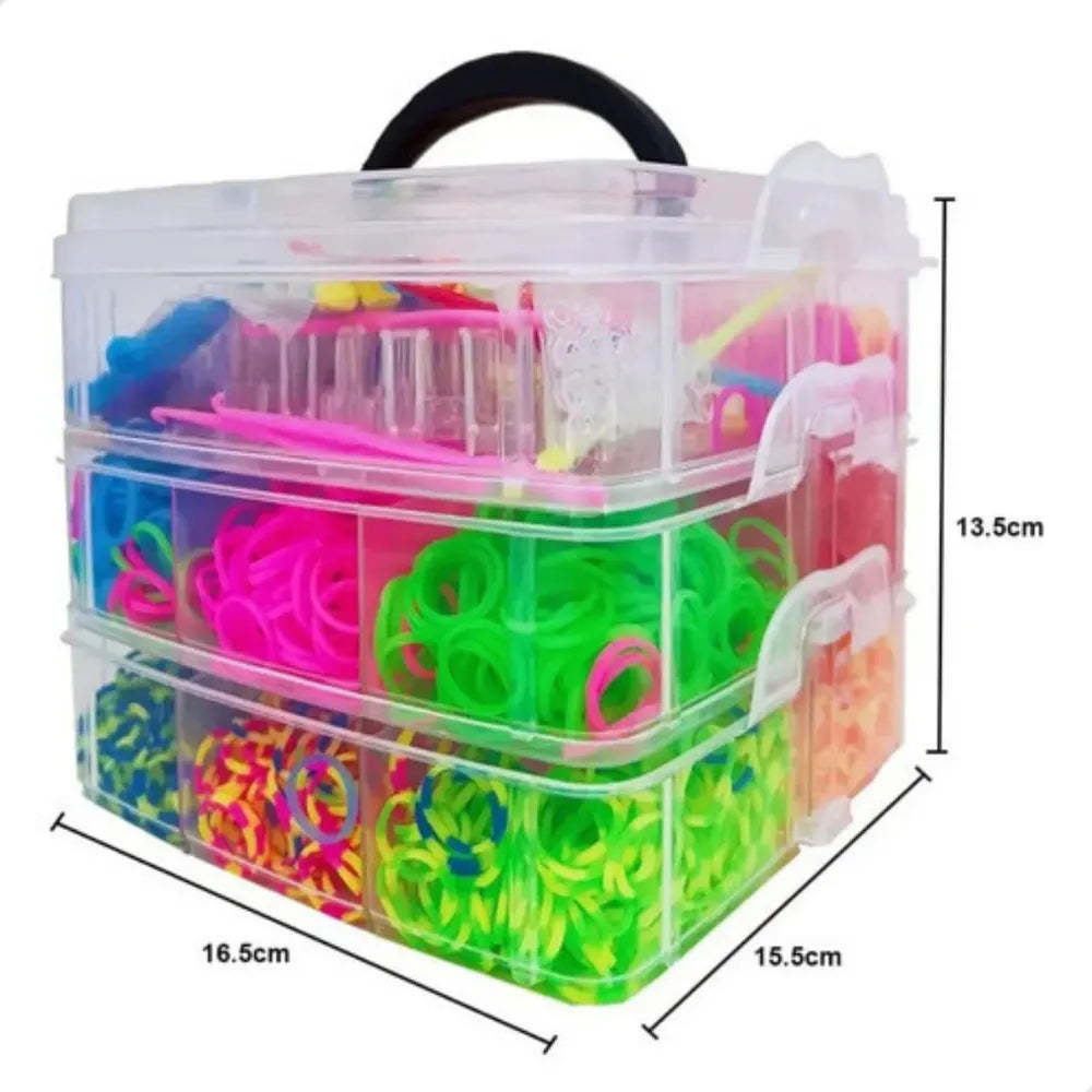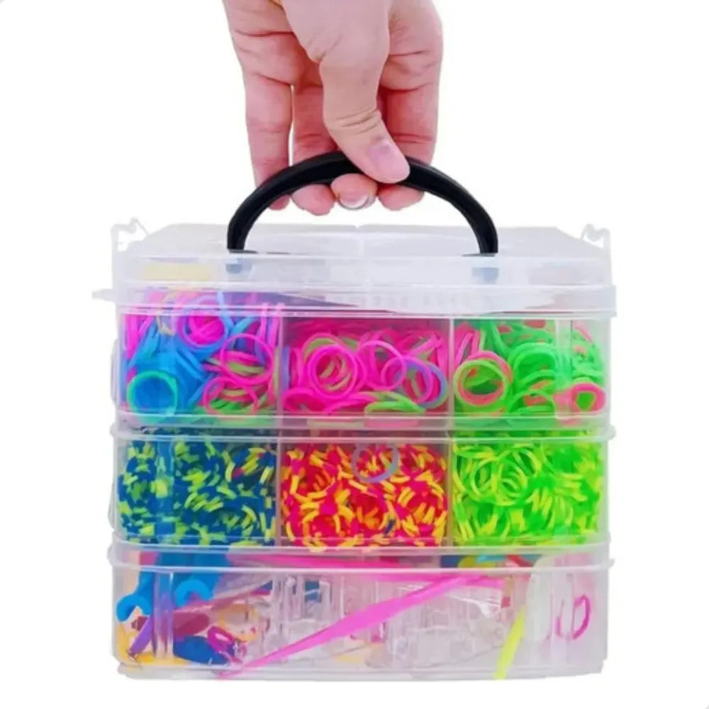 A maleta vem com uma embalagem prática de 3 andares, repleta de aproximadamente 3000 elásticos de diversas cores. Cada andar possui 6 divisões, permitindo que você organize seus materiais de forma eficiente. Além disso, inclui um tear, conectores e agulhas para facilitar a confecção das suas peças. Com uma alça prática para transporte, você pode levar sua maleta para qualquer lugar e compartilhar a diversão com suas amigas.