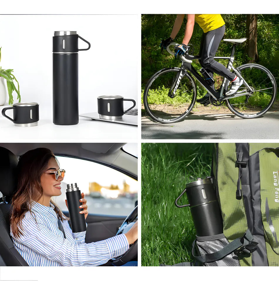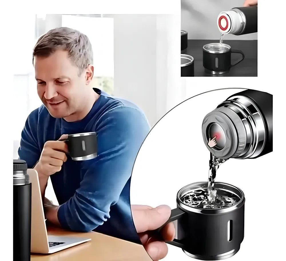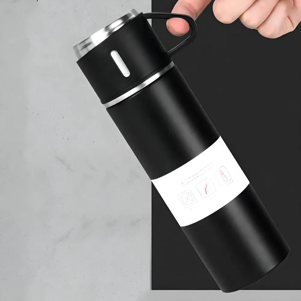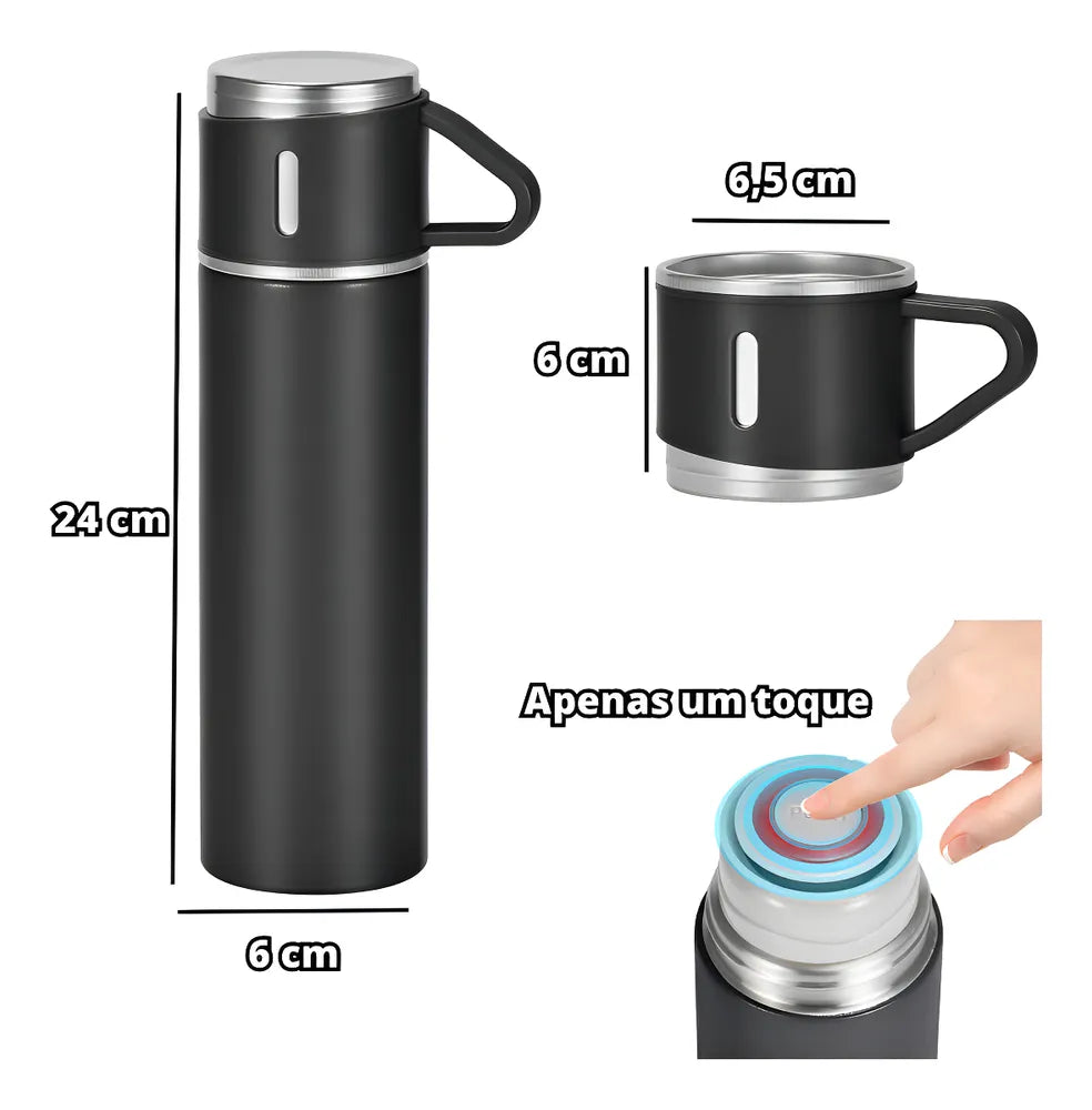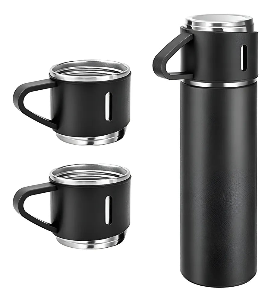O Kit Garrafa Térmica Vacuum Flask Set 500ml com 3 Xícaras Inclusas é o companheiro ideal para quem ama desfrutar de bebidas quentes ou frias em qualquer lugar. Com sua tecnologia de isolamento a vácuo, este produto mantém a temperatura da sua bebida por horas, seja ela quente ou fria.