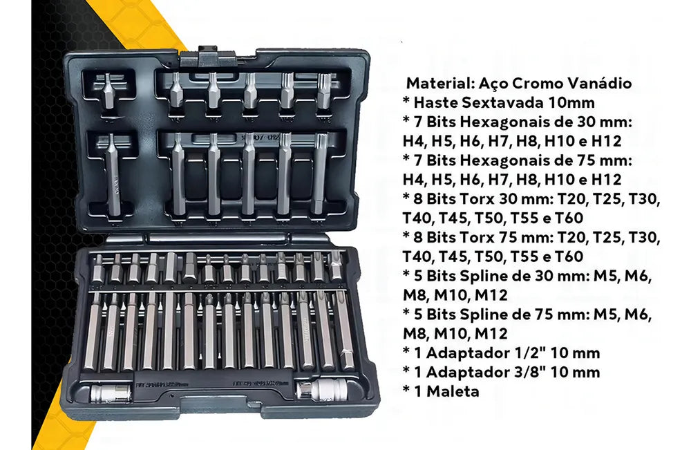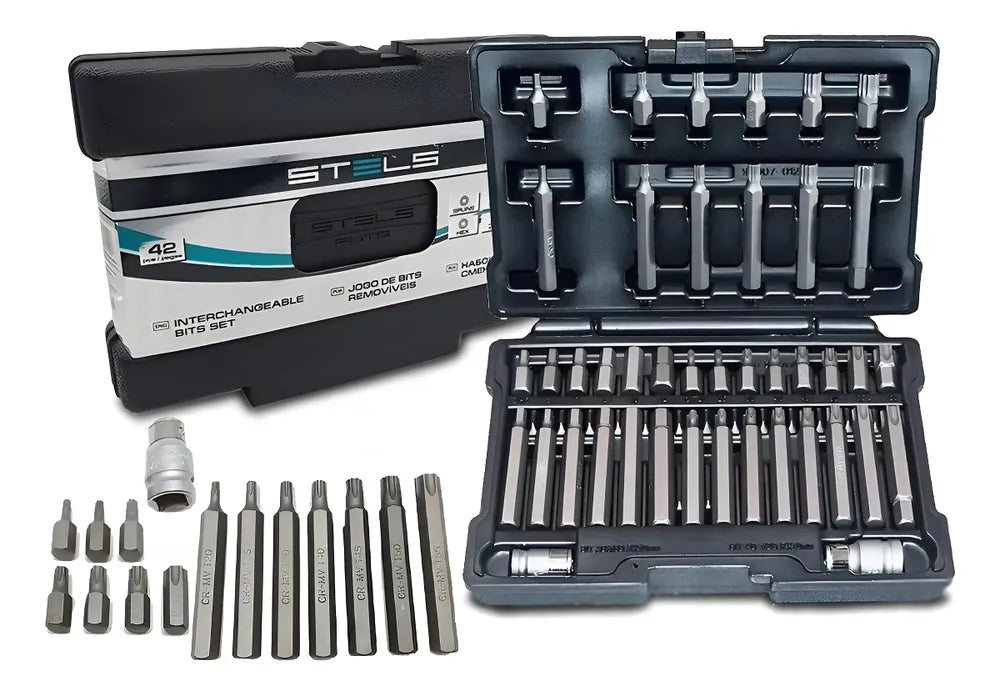 Este jogo de bits completo Torx Allen e Spline de 42 peças é feito de Aço Cromo Vanádio 50-53 HRc. Possui uma haste sextavada de 10mm e vem com: