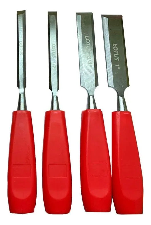 Jogo de 4 Formão reforçado, de lamina reta, em aço carbono forjado e temperado, niquelado, cabo ergonômico de plástico rígido, lamina chanfrada e polida, superfície ampla de golpe na borda do cabo, para entalhar e cortar madeiras.