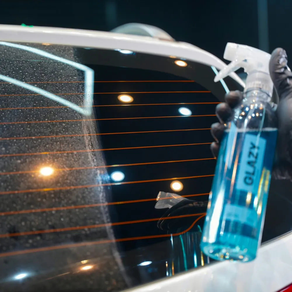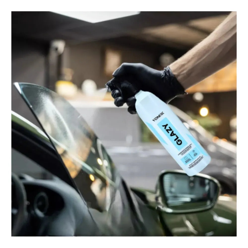 GLAZY é um produto 4 em 1, de alta tecnologia, desenvolvido para vidros em geral, que limpa, protege, condiciona e atua como redutor de riscos. O produto contém polímeros especiais que reduzem o atrito no vidro, diminuindo as chances de riscos causados por limpadores de para-brisas e movimentações dos vidros laterais. Deixa um toque liso e aspecto de vidro novo toque liso.
