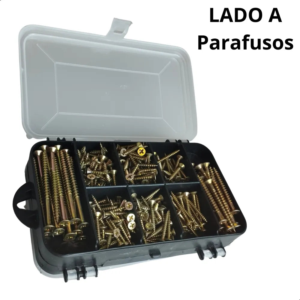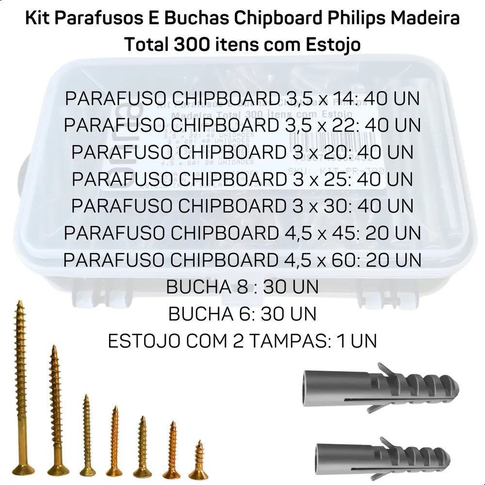 Kit de parafusos Chipboard e Buchas, diversos tamanhos, ideal para o dia a dia de sua casa, oficina ou marcenaria.