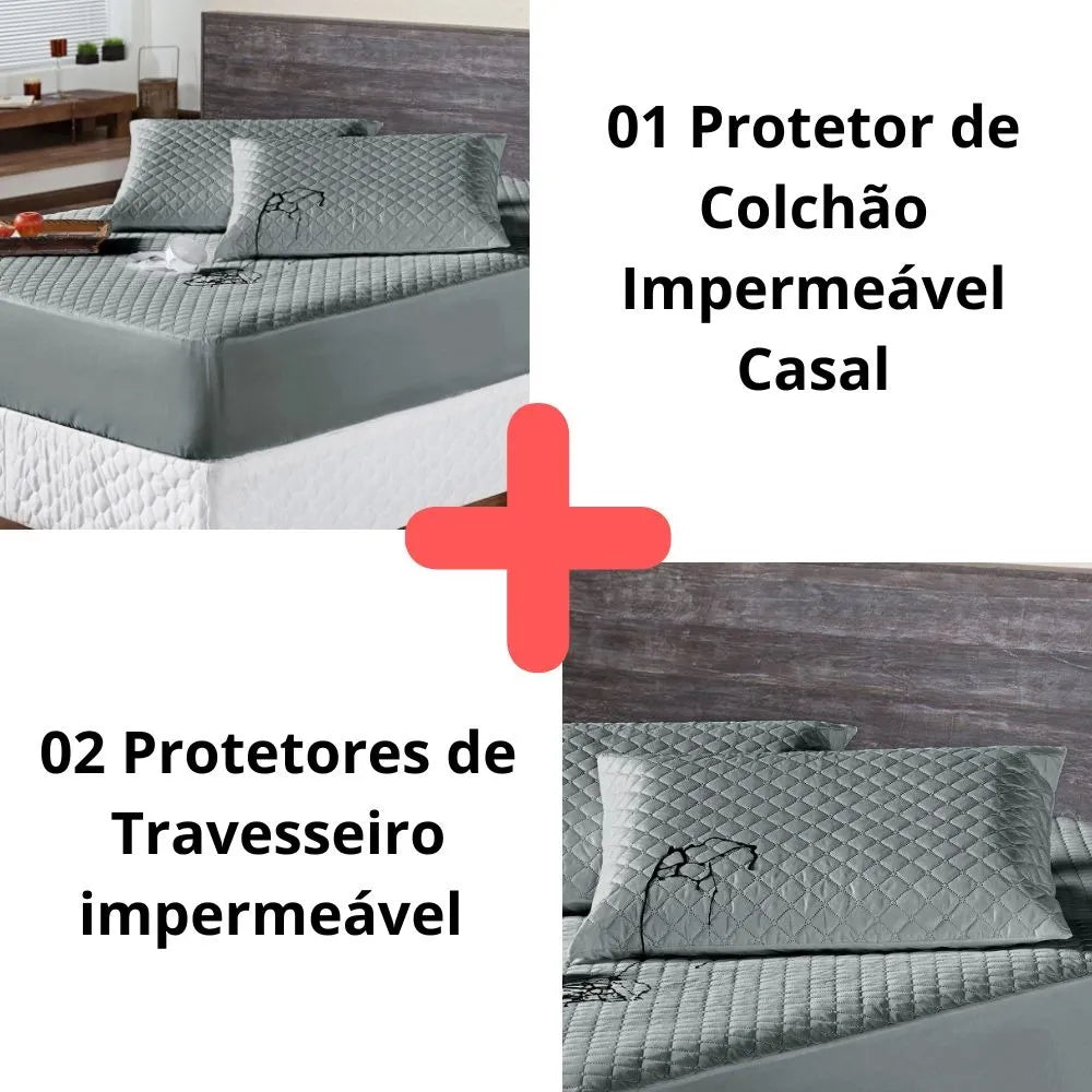 O KIT IMPERMEÁVEL MATELADO é um conjunto indispensável para a sua cama. O protetor e o porta travesseiros impermeável irão proteger o seu colchão e o seu travesseiro de eventuais acidentes com bebidas, líquidos, sujeira em geral e também da transpiração noturna, o que poderá proporcionar maior vida útil para o seu enxoval.