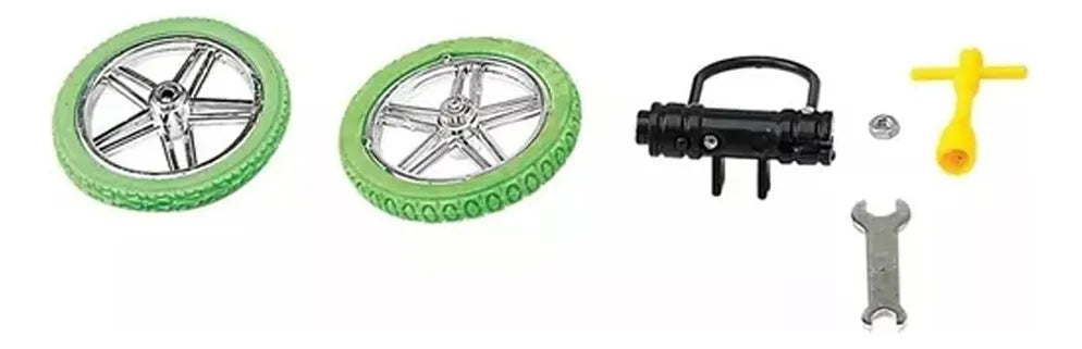 O pacote inclui um skate, uma bicicleta, uma trava de bicicleta, uma porca, duas chaves e duas rodas. Com estas peças, as crianças podem montar e desmontar a bicicleta, estimulando a sua criatividade e habilidades motoras finas.