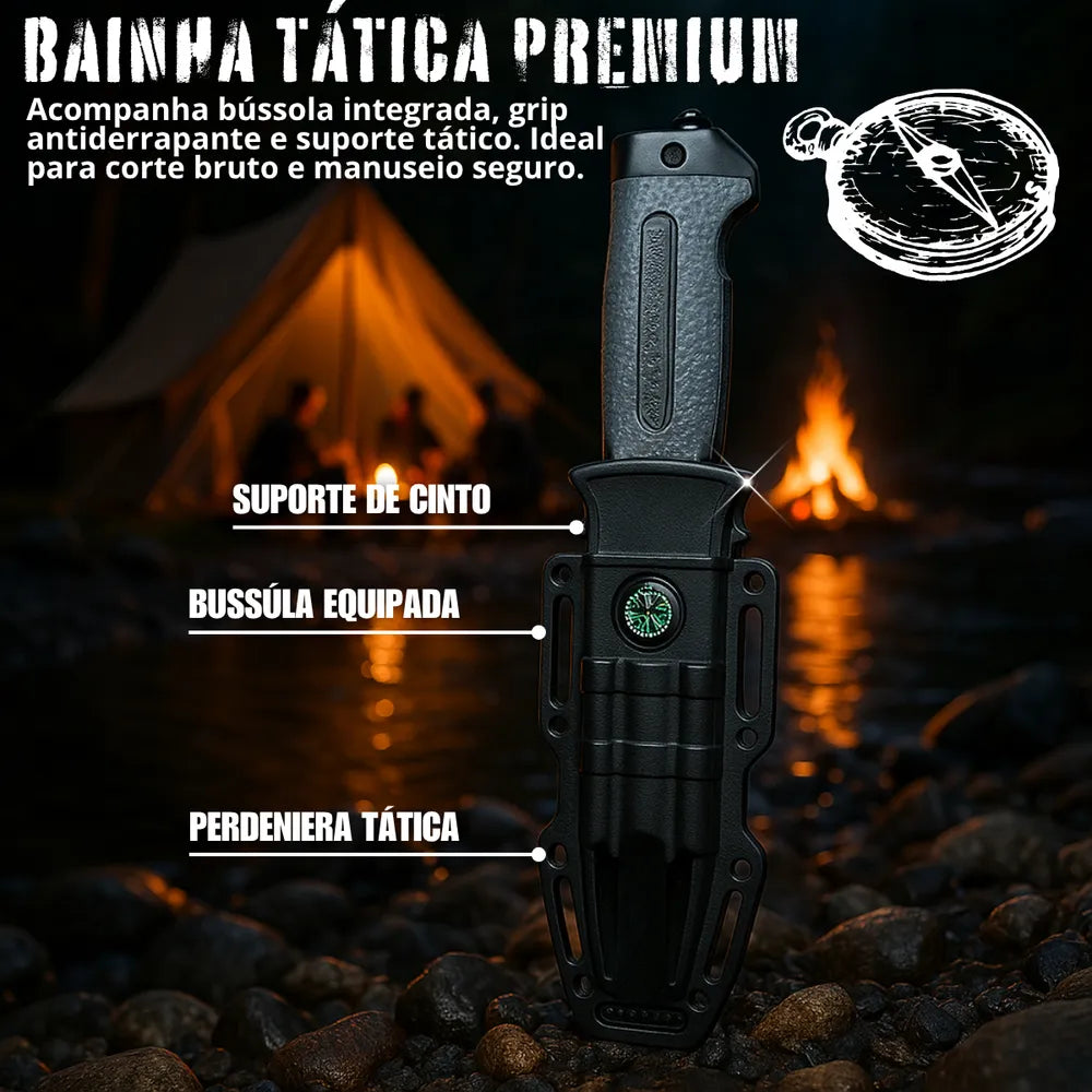 Sim, a bainha da faca tática conta com uma bússola funcional embutida, útil para orientação em locais sem sinal ou trilhas.