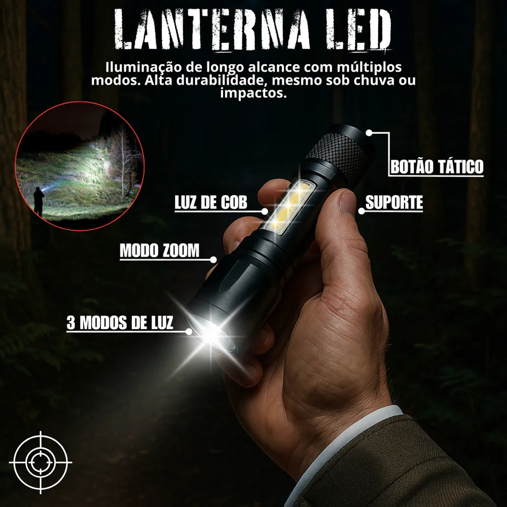 Lanterna LED tática com 3 modos de luz, zoom e luz lateral COB