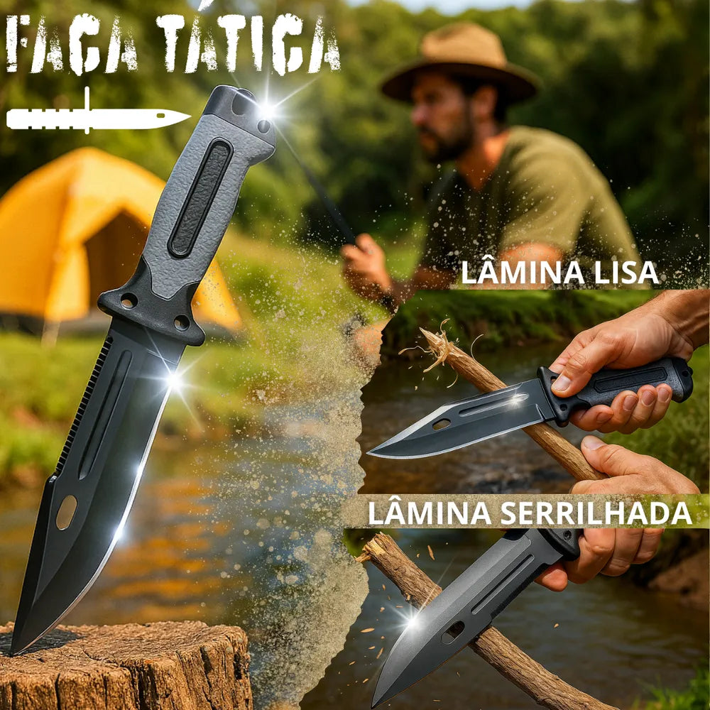 A faca tática militar possui uma lâmina de aço inoxidável com acabamento escurecido, parte serrilhada para cortes rústicos e ponta quebra vidro para resgate. Seu cabo emborrachado tático proporciona firmeza, ergonomia e total controle mesmo em situações extremas. A bainha tática que acompanha é equipada com bússola funcional, suporte para cinto.