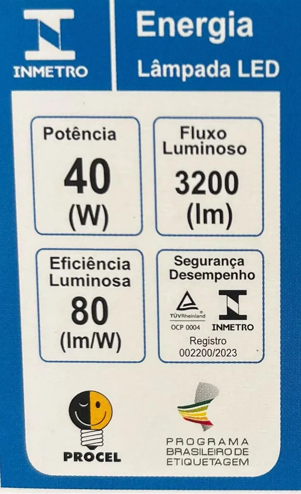 A ALTA POTÊNCIA 40W é ideal para substituir lâmpadas Fluorescentes de alta potência e mistas, pois contém alto FLUXO luminoso.