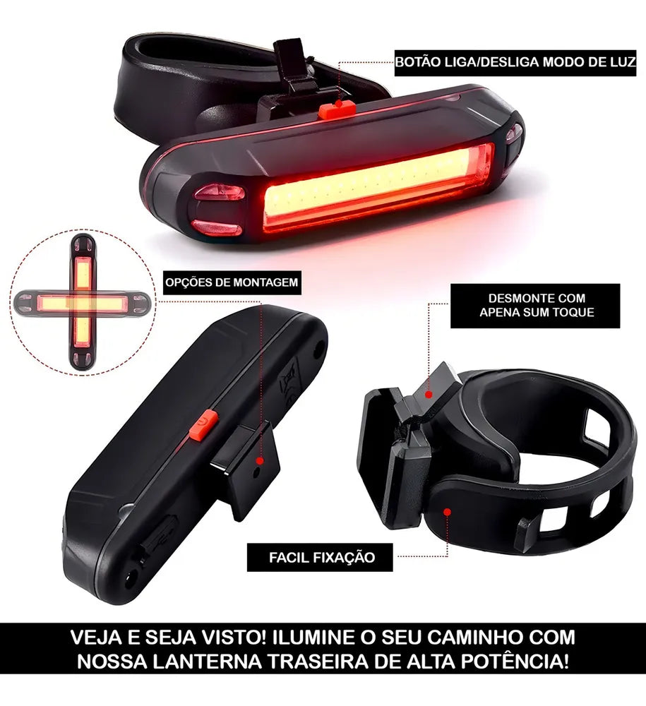 A lanterna é alimentada por uma bateria recarregável, o que a torna uma opção econômica e ecológica. Além disso, ela vem com um cabo USB para facilitar o carregamento. O produto também inclui um suporte de fixação, permitindo que você o instale facilmente na parte traseira da sua bicicleta.