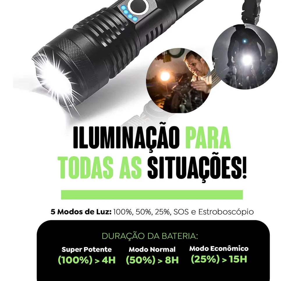Equipado com tecnologia LED, o modelo T9 oferece uma iluminação branca clara e eficiente, ideal para ambientes escuros. A alimentação por bateria garante que você tenha autonomia para longas jornadas, sem se preocupar com a falta de energia.