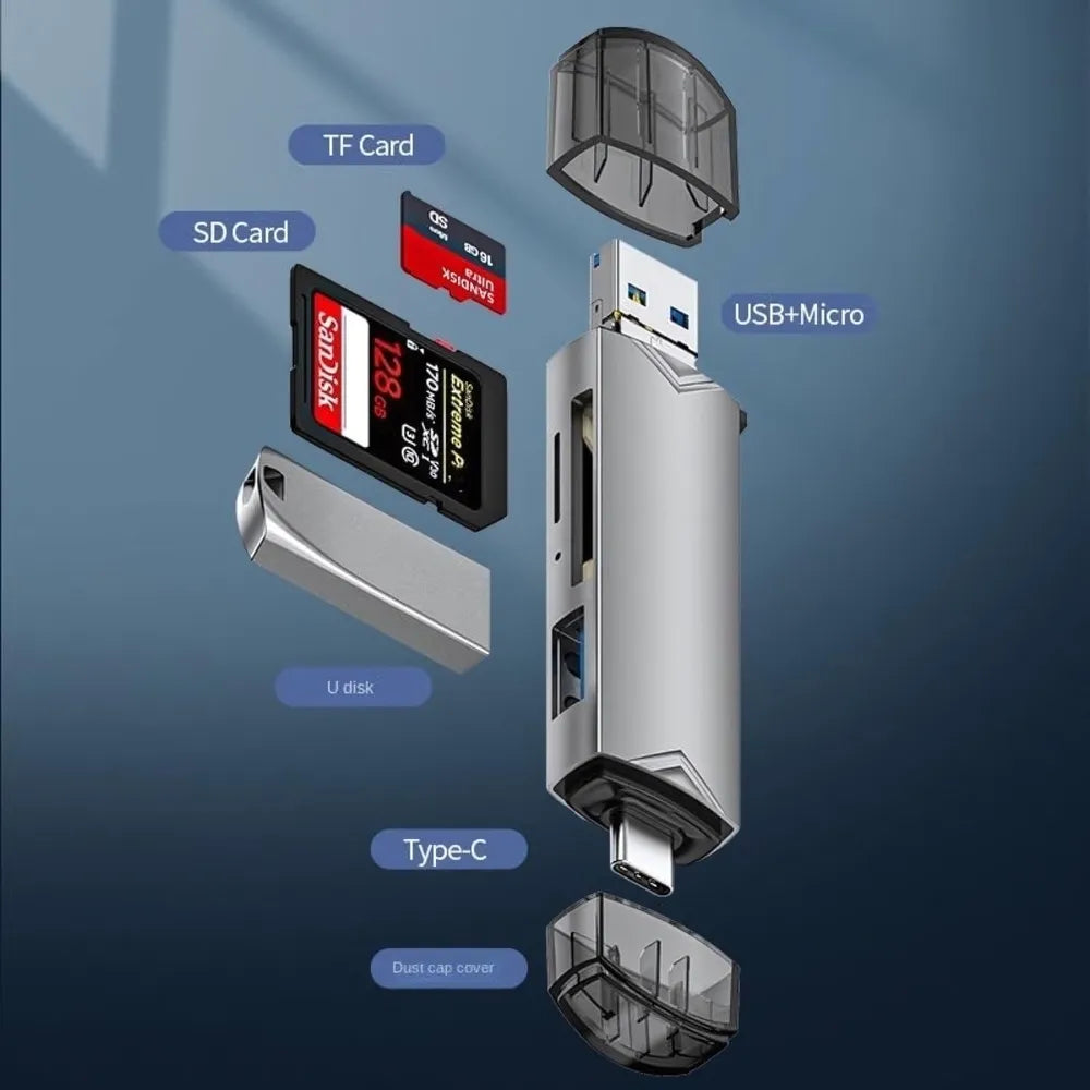O leitor de cartão de memória com conector de entrada USB-C 3.0 de 5Gbps, USB ou Mini-USB, suporta leitura e transferência de dados através dos cartões de Memória SD TF ou USB.
