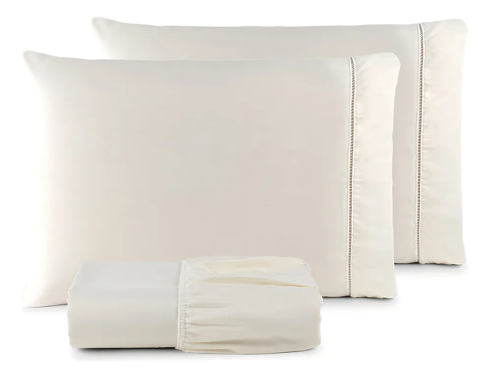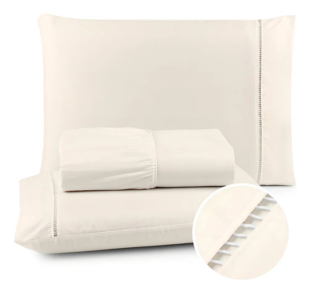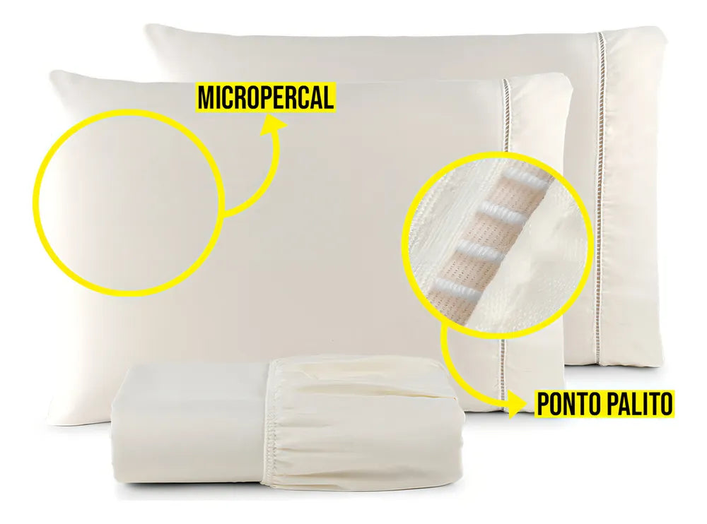Feito com tecido Texfine de alta qualidade, esse conjunto oferece um toque incrivelmente suave e aconchegante, perfeito para noites de sono relaxantes e revigorantes. O acabamento em ponto palito, que combina o clássico ao refinado, adiciona um toque de elegância ao design, enquanto o elástico em todo o contorno do lençol garante um ajuste seguro ao colchão, facilitando seu dia a dia e mantendo tudo sempre em ordem.