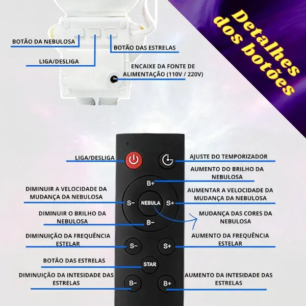 Eu amei, fica muito lindo, é incrível. Tem uma cobertura muito longa, além do teto chega nas paredes. Vi em alguns comentários falando que o controle não funciona, mas funciona siim (porém a conexão está nas costa do astronauta como sinalizado na foto com um quadradinho). Simplesmente incrível. 🥰🥰.