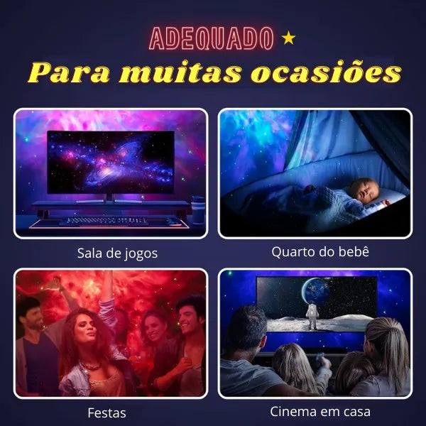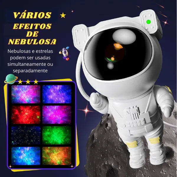 Meu filho amou. Não são muitas opções de projeção, existe a nebulosa e estrelas. As variações são algumas cores na nebulosa (exemplo, vermelho, azul e verde) e a combinação das três cores. Também dá para modificar o tamanho, velocidade e intensidade das cores, só que esses parâmetros não tem muita diferença quando estão no mínimo ou no máximo, é quase que igual. A nebulosa é projetada e é muito bonita. As estrelas são geradas pelo laser na cor verde (somente verde) e você pode variar nas opções fixa ou deixar ele cintilando (aumenta o brilho e diminui até desaparecerem todas as estrelas juntas). Tem opções de brilho mais intenso e menos mas a diferença é pouca e só funciona com a estrelas fixas. Já opção de velocidade dá para notar o cintilando mais rapido ou mais lento. No geral é algo muito bonito para projetar no teto e as estrelas (dependendo do tamanho do quarto) se projetam em todas as paredes, dá uma grande imersão. Meu filho adorou.