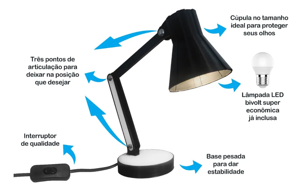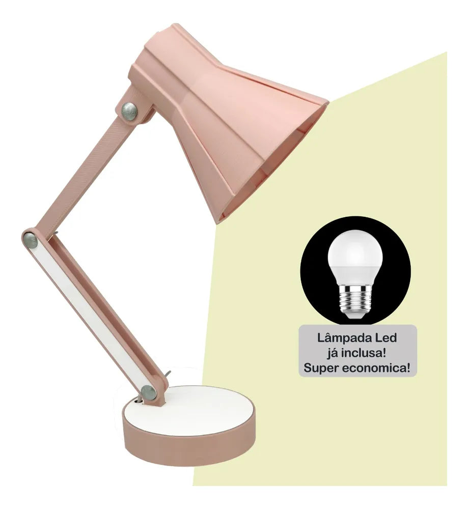 A luminária articulada de mesa é uma opção prática e eficiente para iluminar de forma adequada o ambiente de trabalho, estudo ou até para sua escrivaninha ao lado da cama. Com sua estrutura articulada, a luminária pode ser ajustada de acordo com a preferência do usuário, direcionando a luz para onde ela é necessária. Além disso, sua base é estável, proporcionando uma fixação segura e evitando que a luminária caia ou se mova.