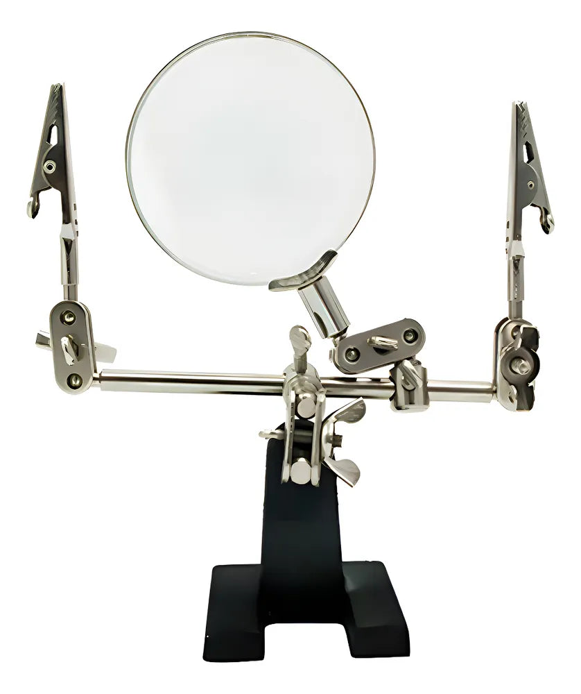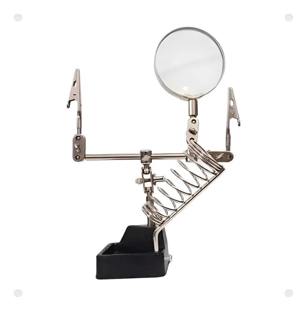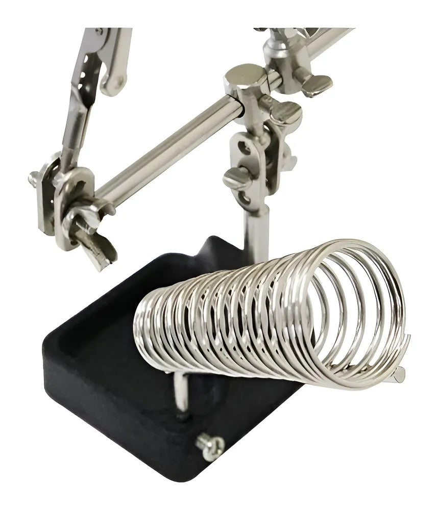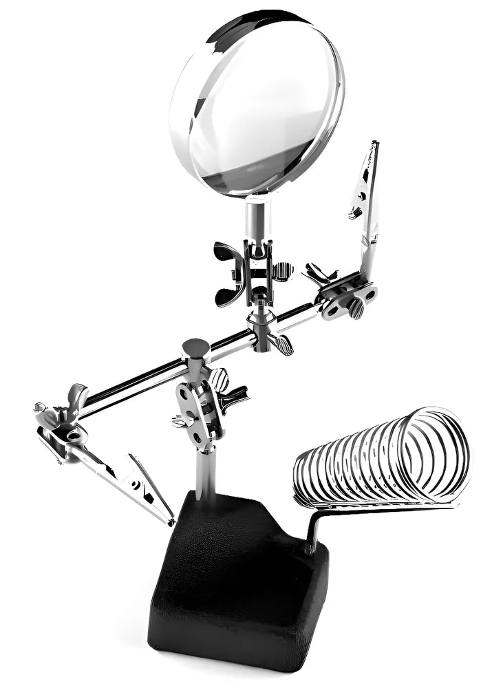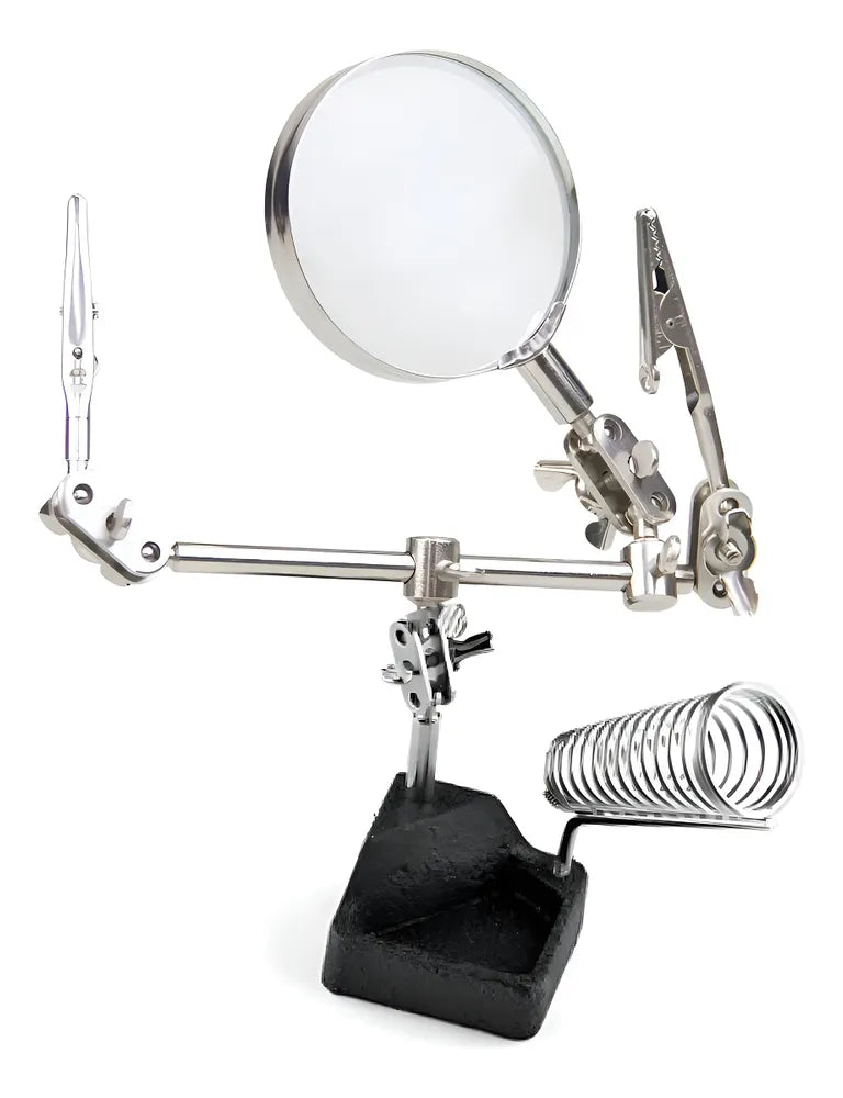 Lupa com garras com suporte para ferro de solda. Serve para fixar a peça a ser soldada ou retrabalhada, para melhor visualização dos componentes a serem soldados, e suporte para apoiar o ferro de solda no momento de descanso e análise do equipamento soldado.