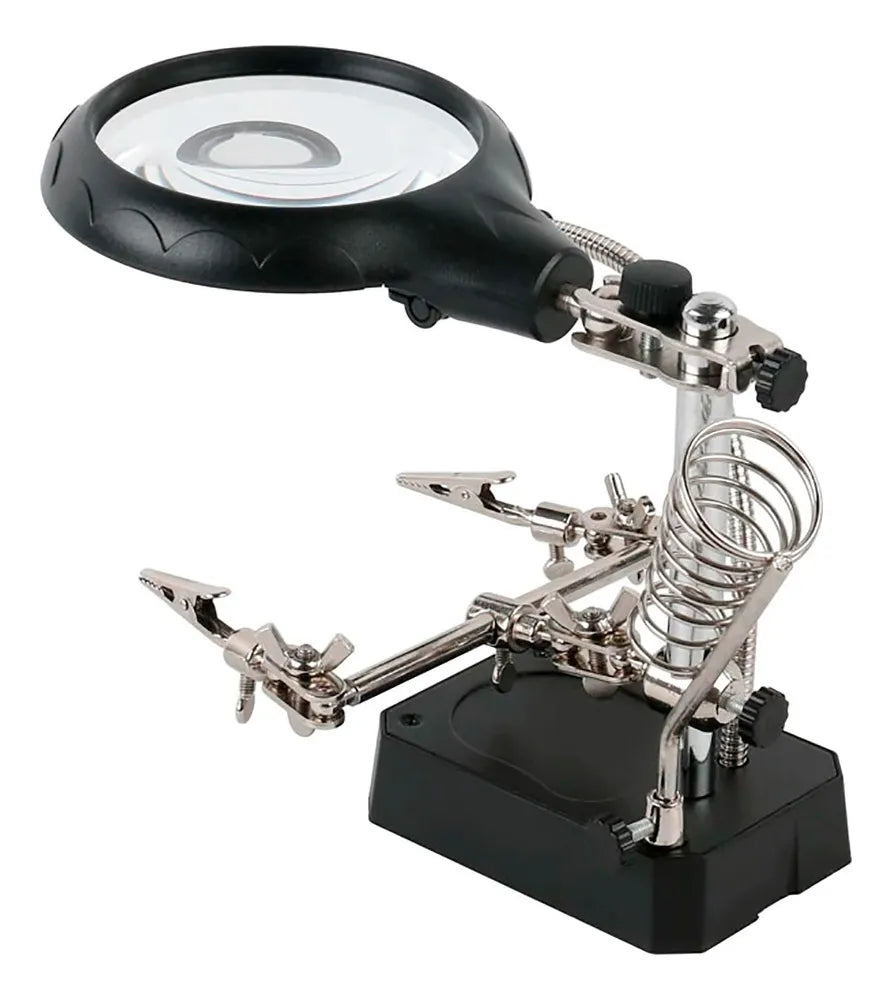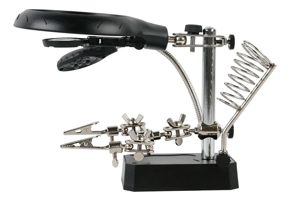 Esta lupa facilita a observação de detalhes em seu trabalho. Possui garras para fixação e iluminação integrada por LED, com 1 lente que oferece ampliação de 10X e 2,5x. Sua alimentação pode ser via cabo USB ou pilha.