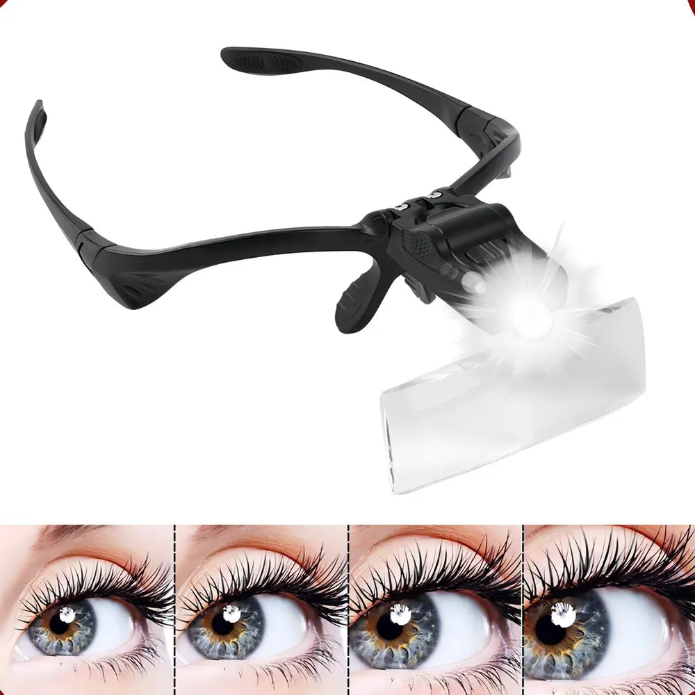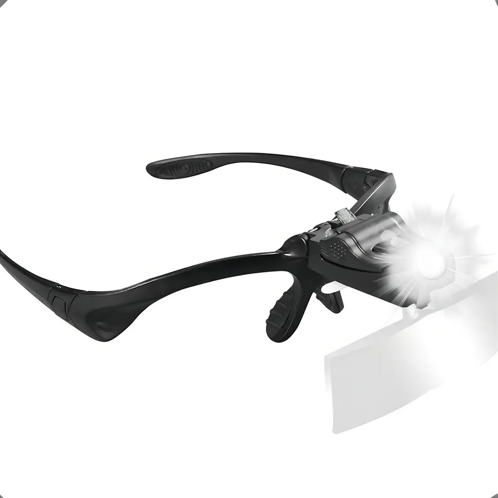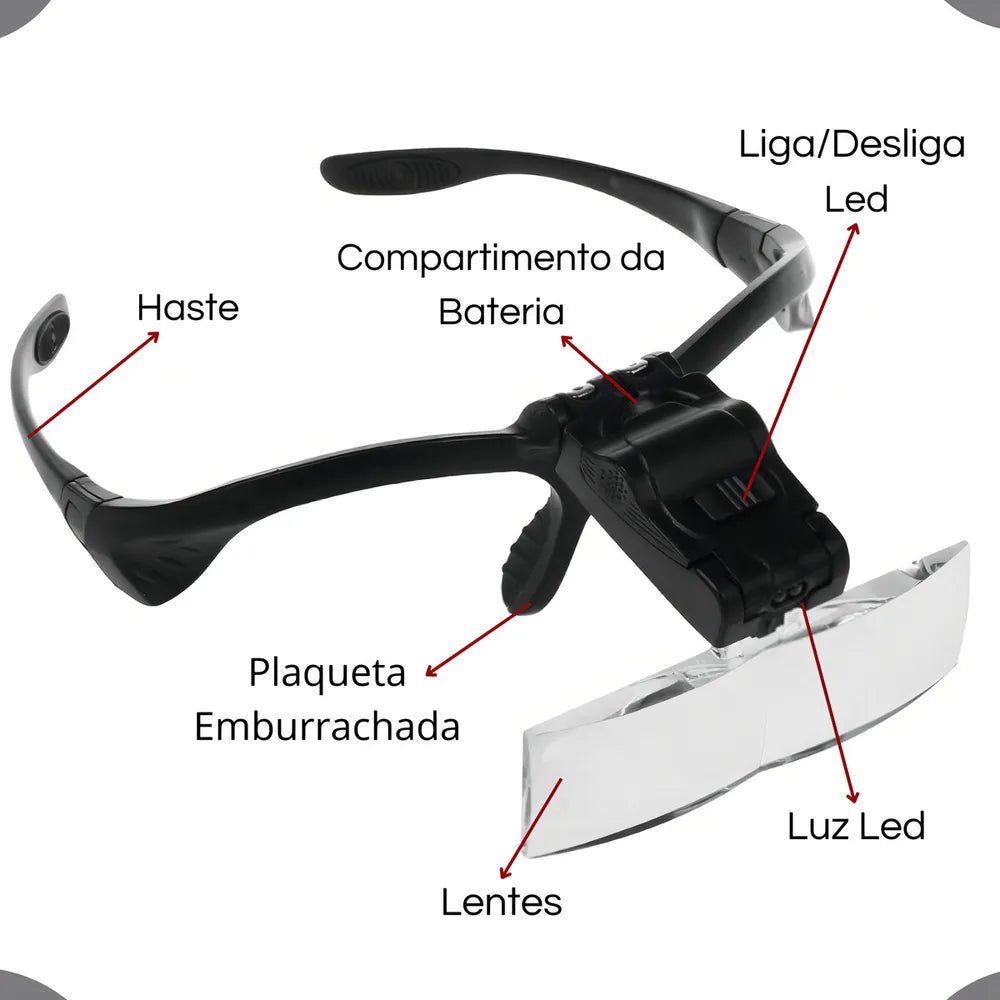 As Lentes + Luz Led vai te ajudar a enxergar melhor e aumentar a qualidade do seu trabalho! Diferente das lupas do mercado, Glass permite que você tenha as mãos livres para trabalhar, tendo sua visão ampliada. Além de 5 tipos diferentes do lentes ampliadoras, possui uma tecnologia Led de Luz aumenta, que permite maior iluminação e melhora do campo de visão. Esse óculos amplia objetos ou superfícies em até 3.5x . Ele é equipado com 2 lâmpadas alimentadas por 3 baterias que auxiliam na observação de detalhes.