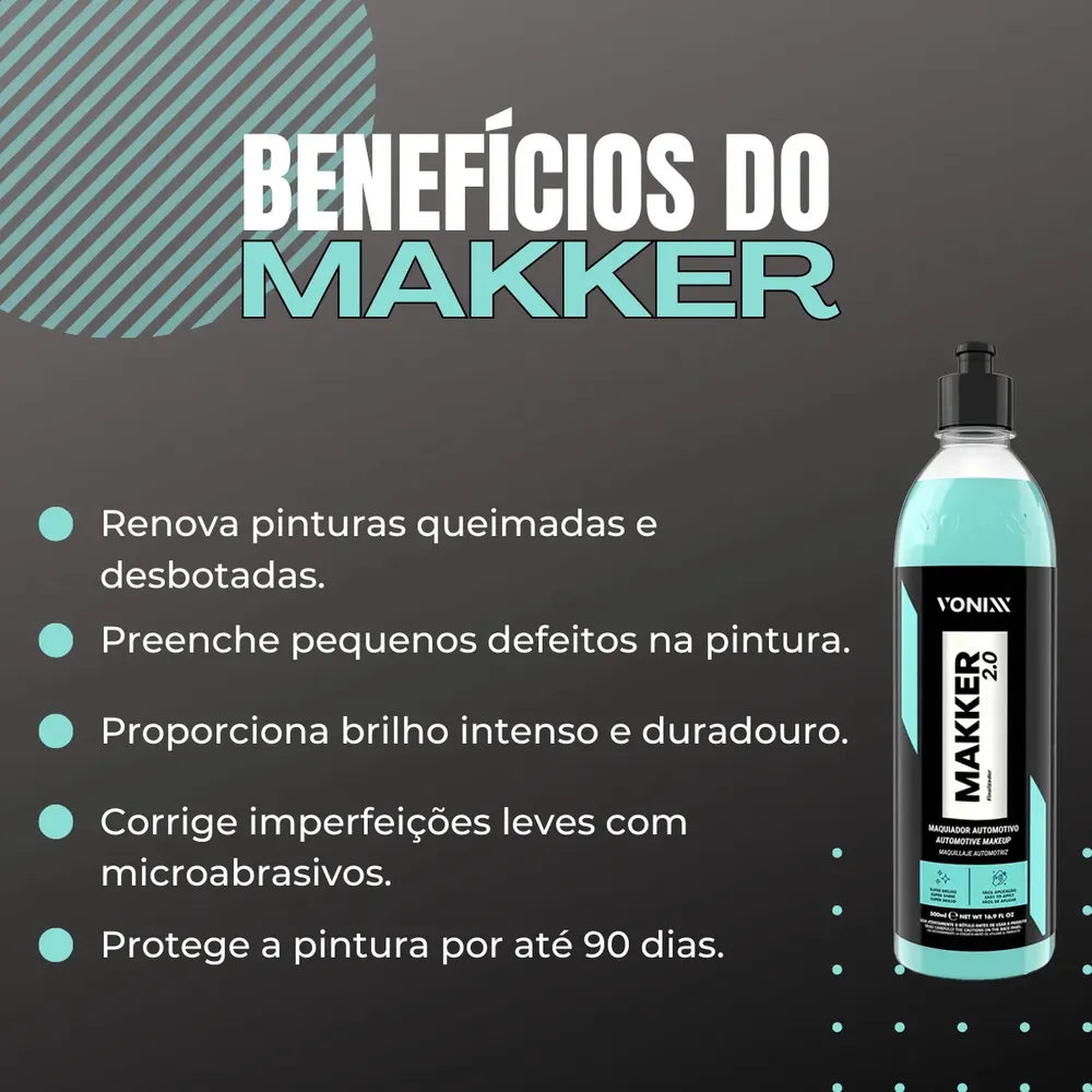 Maquiador Automotivo. Desenvolvido para preencher pequenos defeitos e renovar pinturas, proporcionando brilho máximo e toque liso. Sua fórmula exclusiva com microabrasivos especiais também corrige defeitos leves, podendo ser aplicada manualmente com aplicador de microfibra ou com máquina. Garante proteção e acabamento perfeito.