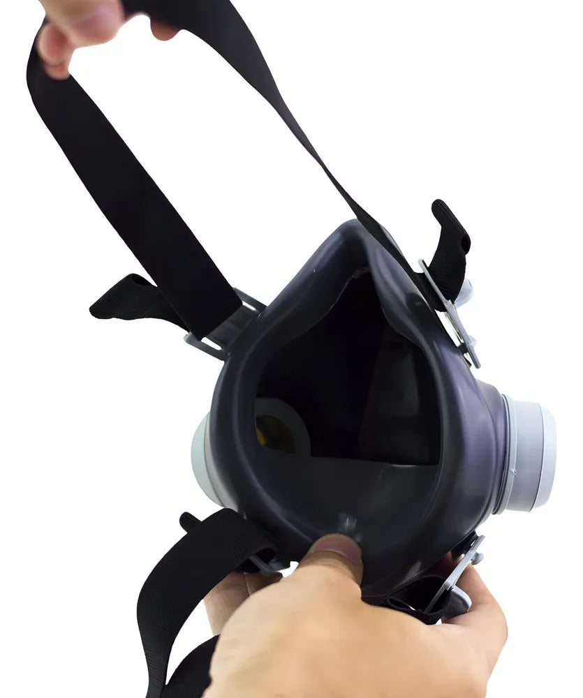 Máscara: o corpo do respirador é moldado em elastômero sintético ultramacio e não tóxico, com bordas interiores acolchoadas, proporcionando um vedamento eficaz para diferentes formas de rosto. Equipado com uma válvula de inalação e duas válvulas de exalação. A haste de montagem frontal, o conector do filtro, as válvulas e os cartuchos são feitos de plástico resistente ao calor. Oferece uma fixação em quatro pontos, com correias elásticas ajustáveis com regulação de pressão, permitindo fácil ajuste de comprimento.