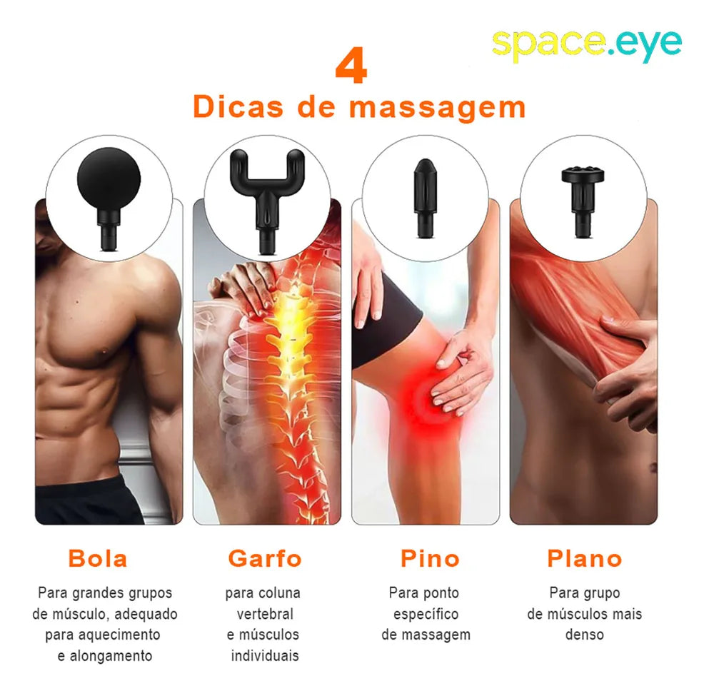 A Pistola Massageadora é perfeita para esportistas e quem sofre com dores musculares do dia a dia. A terapia percussiva acelera a recuperação, reduz dores, melhora a circulação e diminui o ácido lático. Sua cabeça substituível permite massagens multi-angulares e o ajuste livre de ângulo. São 4 cabeças exclusivas para pescoço, ombro, costas e pernas e 6 velocidades ajustáveis.