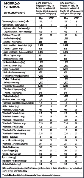 Sabor : Baunilha Proteína concentrada do soro do leite (WPC), proteína isolada do soro do leite (WPI), proteína hidrolisada do soro do leite (WPH), mix de vitaminas e minerais (ácido ascórbico (vitamina C), nicotinamida (vitamina B3), acetato de DL-alfatocoferol (vitamina E), D-pantotenato de cálcio (vitamina B5), cloridrato de piridoxina (vitamina B6), riboflavina (vitamina B2), tiamina mononitrato (vitamina B1), sulfato cúprico (cobre), acetato de retinol (vitamina A), ácido fólico, iodeto de potássio (iodo), molibdato de sódio (molibdênio), picolinato de cromo (cromo), selenito de sódio (selênio), Dbiotina (vitamina H), cianocobalamina (vitamina B12)), emulsificante lecitina de soja*, aromatizante e edulcorante sucralose.