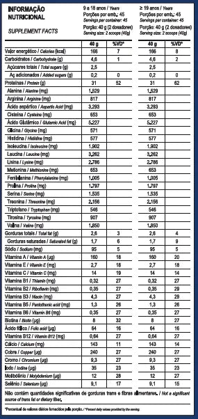 Sabor : Baunilha Proteína concentrada do soro do leite (WPC), proteína isolada do soro do leite (WPI), proteína hidrolisada do soro do leite (WPH), mix de vitaminas e minerais (ácido ascórbico (vitamina C), nicotinamida (vitamina B3), acetato de DL-alfatocoferol (vitamina E), D-pantotenato de cálcio (vitamina B5), cloridrato de piridoxina (vitamina B6), riboflavina (vitamina B2), tiamina mononitrato (vitamina B1), sulfato cúprico (cobre), acetato de retinol (vitamina A), ácido fólico, iodeto de potássio (iodo), molibdato de sódio (molibdênio), picolinato de cromo (cromo), selenito de sódio (selênio), Dbiotina (vitamina H), cianocobalamina (vitamina B12)), emulsificante lecitina de soja*, aromatizante e edulcorante sucralose.