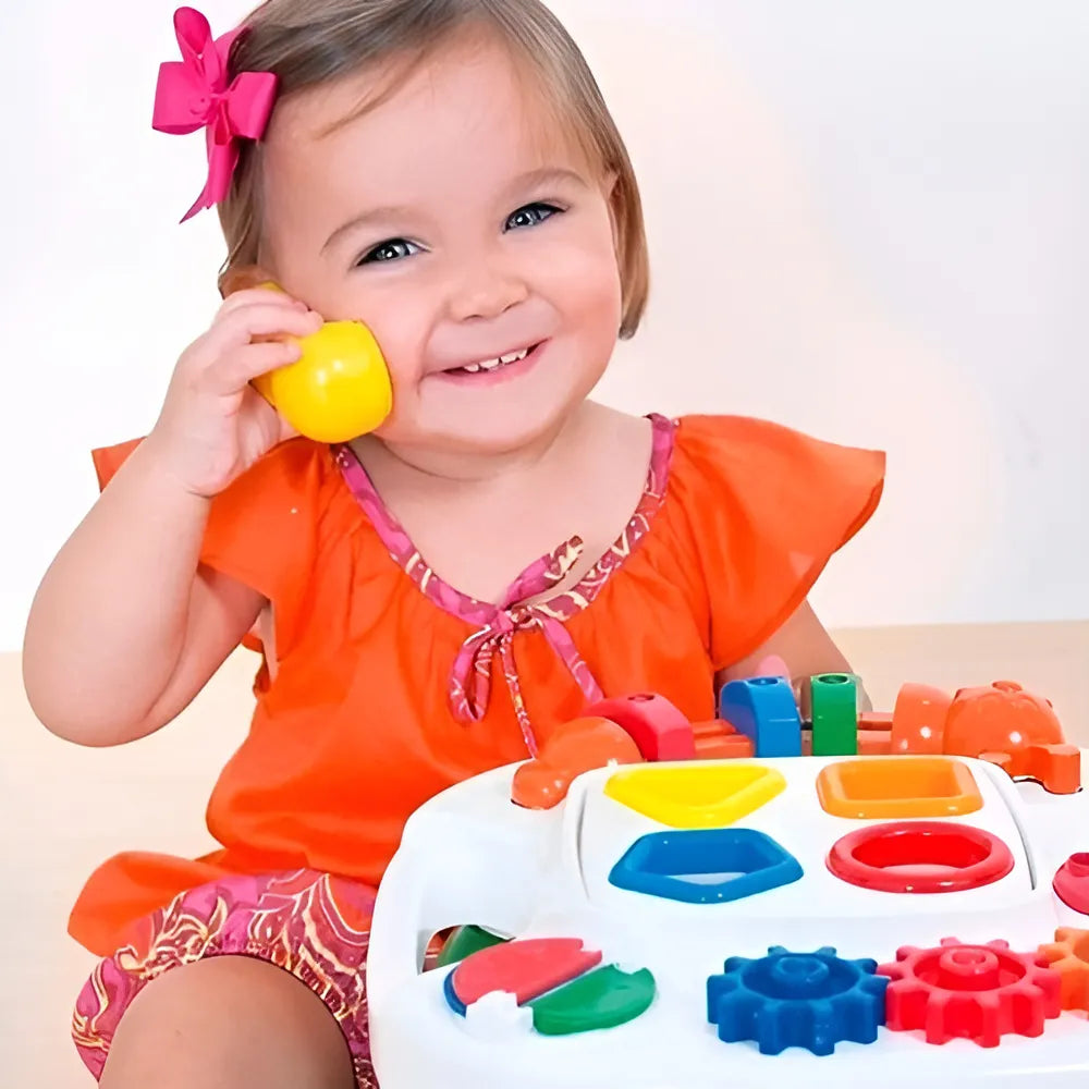 A Mesa Divertida Play Time Cotiplás diverte e distrai o bebê, auxiliando na coordenação motora, na distinção de formas e cores. É um brinquedo seguro. Inclui um telefoninho com discador que emite sons, blocos didáticos, deslizante personalizado e engrenagens que giram.