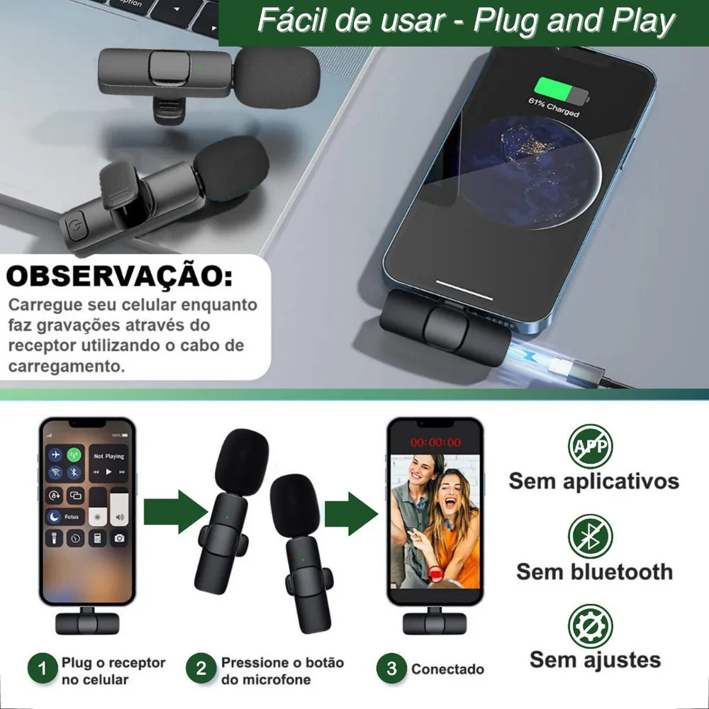 Este microfone é ideal para conversas, reuniões de vídeo, gravações de música, TikTok, Youtube, Lives, Streamings, etc. Possui um grampo giratório de 360 graus para você fixá-lo na gola, gravata ou bolso com facilidade. É compatível com diversos modelos de Celulares IOS.